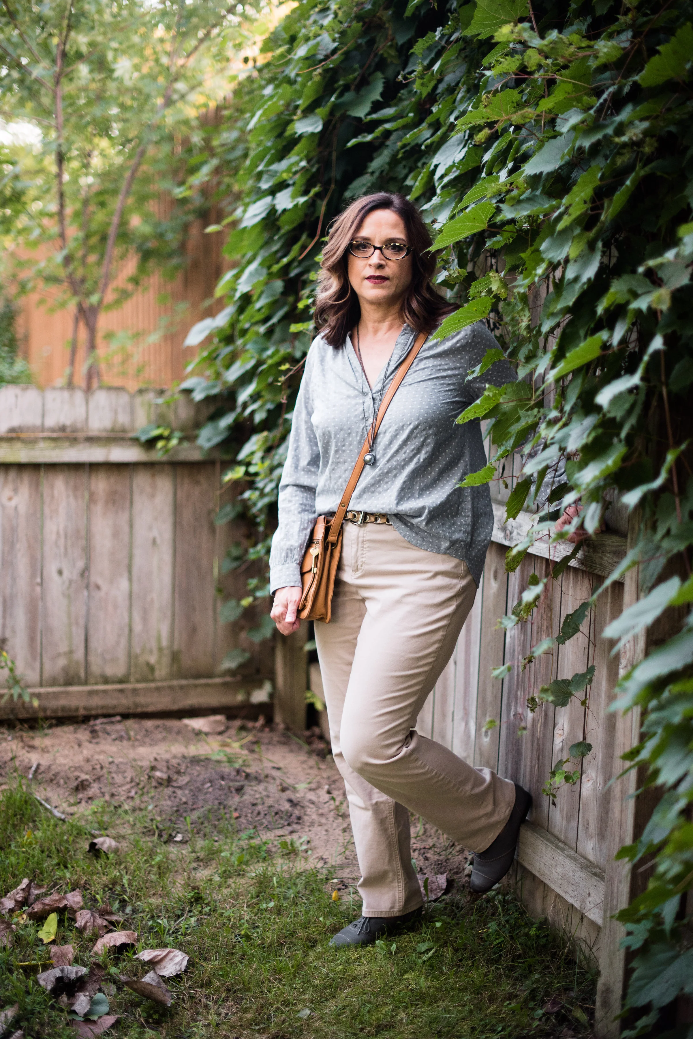 This popover top is from Loft, though I found it at a thrift store. The light gray background falls in the lighter shade of Sharkskin and is then pocked with white spots. I paired the light gray with a light pair of khakis.