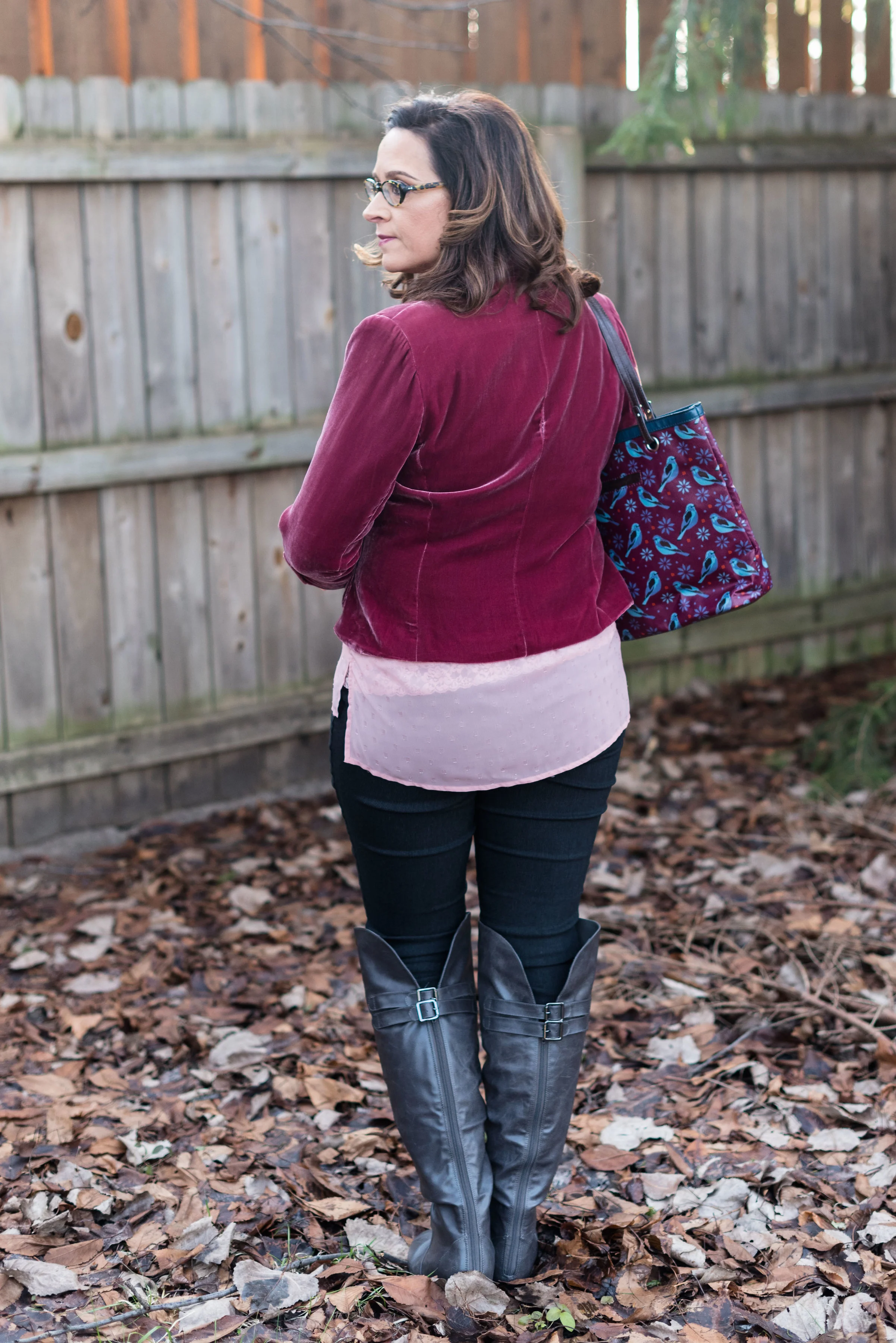 For today's look, I went back to my berry colored velvet jacket. This time I layered it over a light pink chiffon top with a hi-lo hemline. I added a pair of Christopher and Banks skinny pull on pin striped pants and my gray over-the-knee boots.