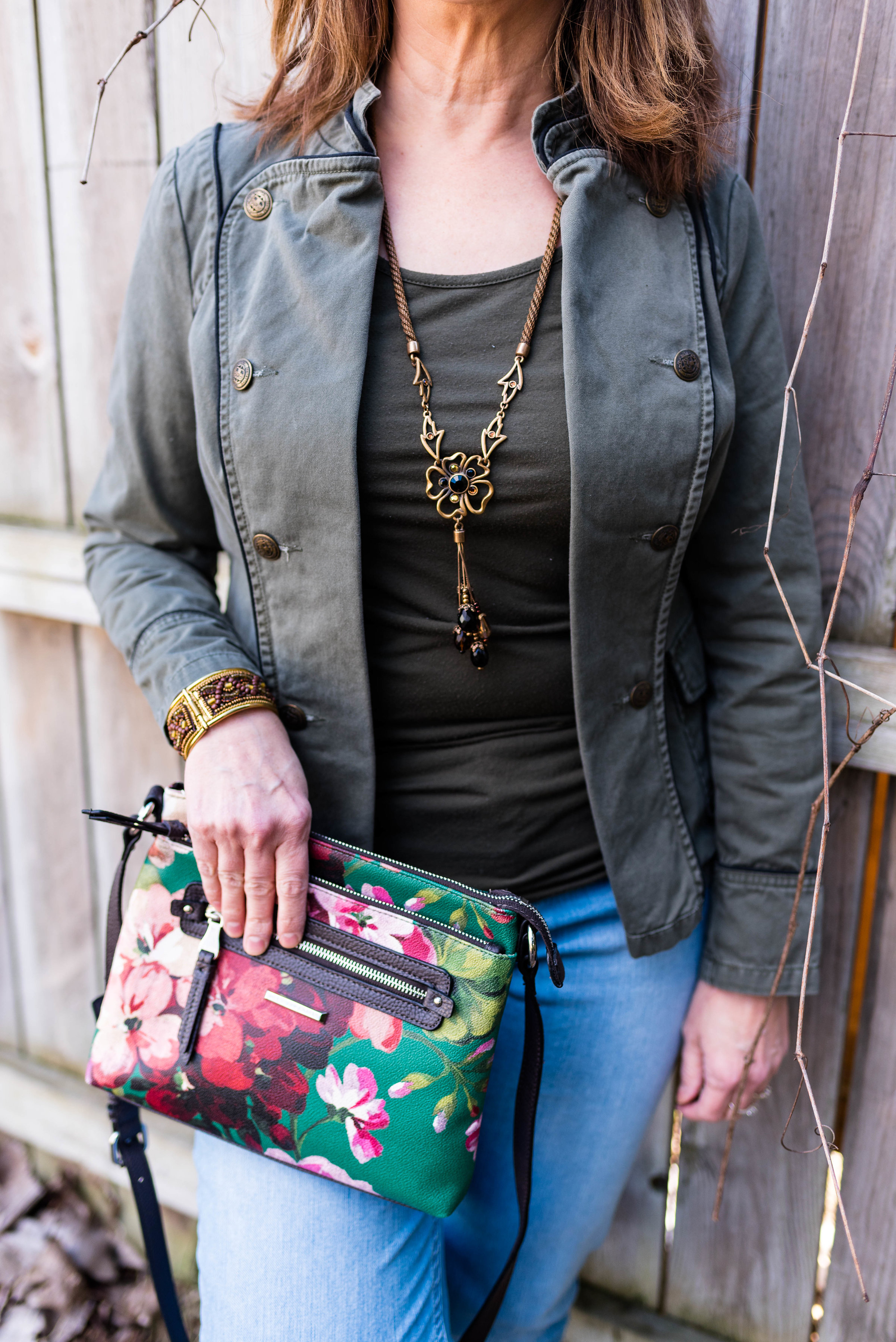 My accessories included a statement necklace and beaded cuff bracelet. For my main pop of color I chose this floral Dana Buchman cross body bag from Kohl's which I found early this spring. Here's a cute straw version.