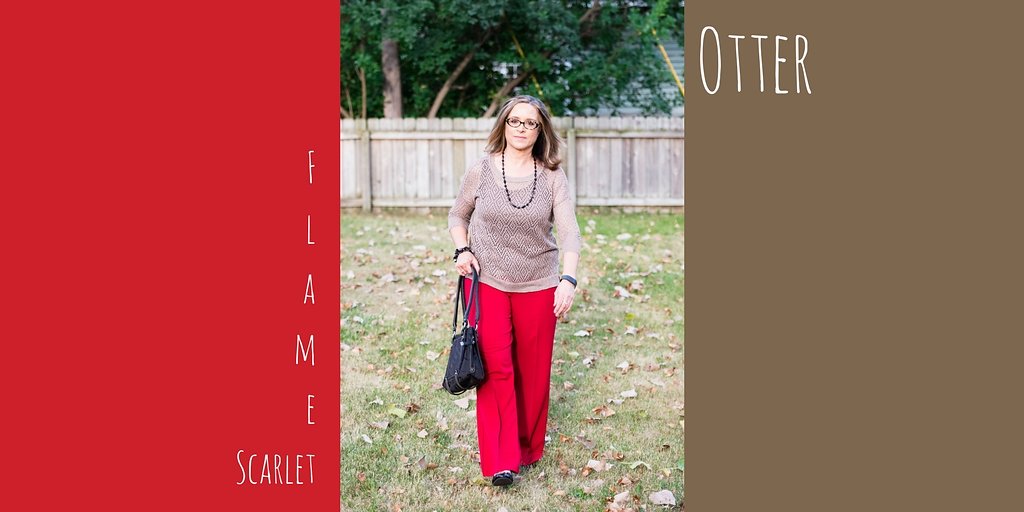 To keep this series to a minimum I decided to challenge myself to come up with outfits that use two of the colors at a time. This week I am featuring a bold, rich red labeled Flame Scarlet, paired with a warm hue called Otter.