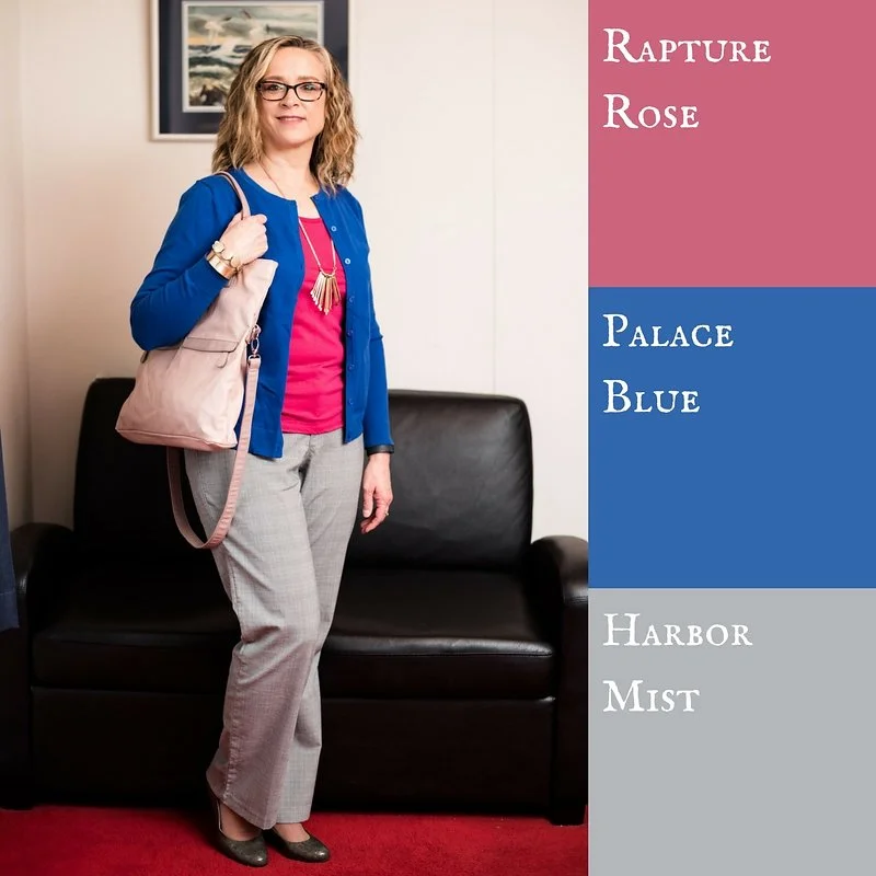Once again, this week, I am featuring two more Pantone Spring 2018 colors from the London palette, along with another of the classic colors, Harbor Mist. Rapture Rose is a bright pinkish red that adds a perfect pop of color to any outfit. Palace blue evokes a feeling of royalty and will add a classic element that says regal, complimenting any style. Grounding the whole look is a soft, light gray reminiscent of mists coming off the ocean.