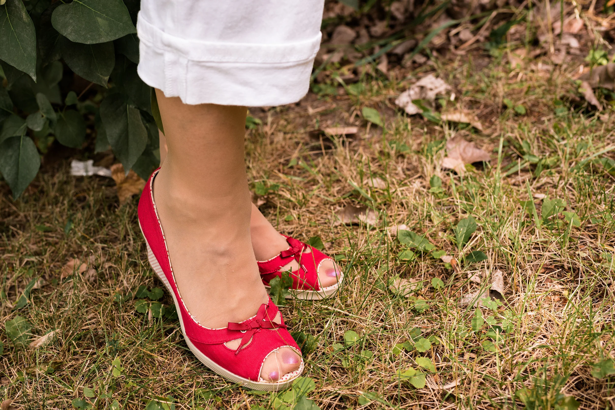 I really like these Ked wedge heel peep toes, but they do have a tendency to slide off my heel. I need to get some of those gel pads to put in the back that help keep you heel in the shoe. Other than that these are quite comfortable and have a cute retro vibe. The wedges even have red polka dots on them. Here are a few options from DSW including a canvas stripe, a black textured, and a denim blue.