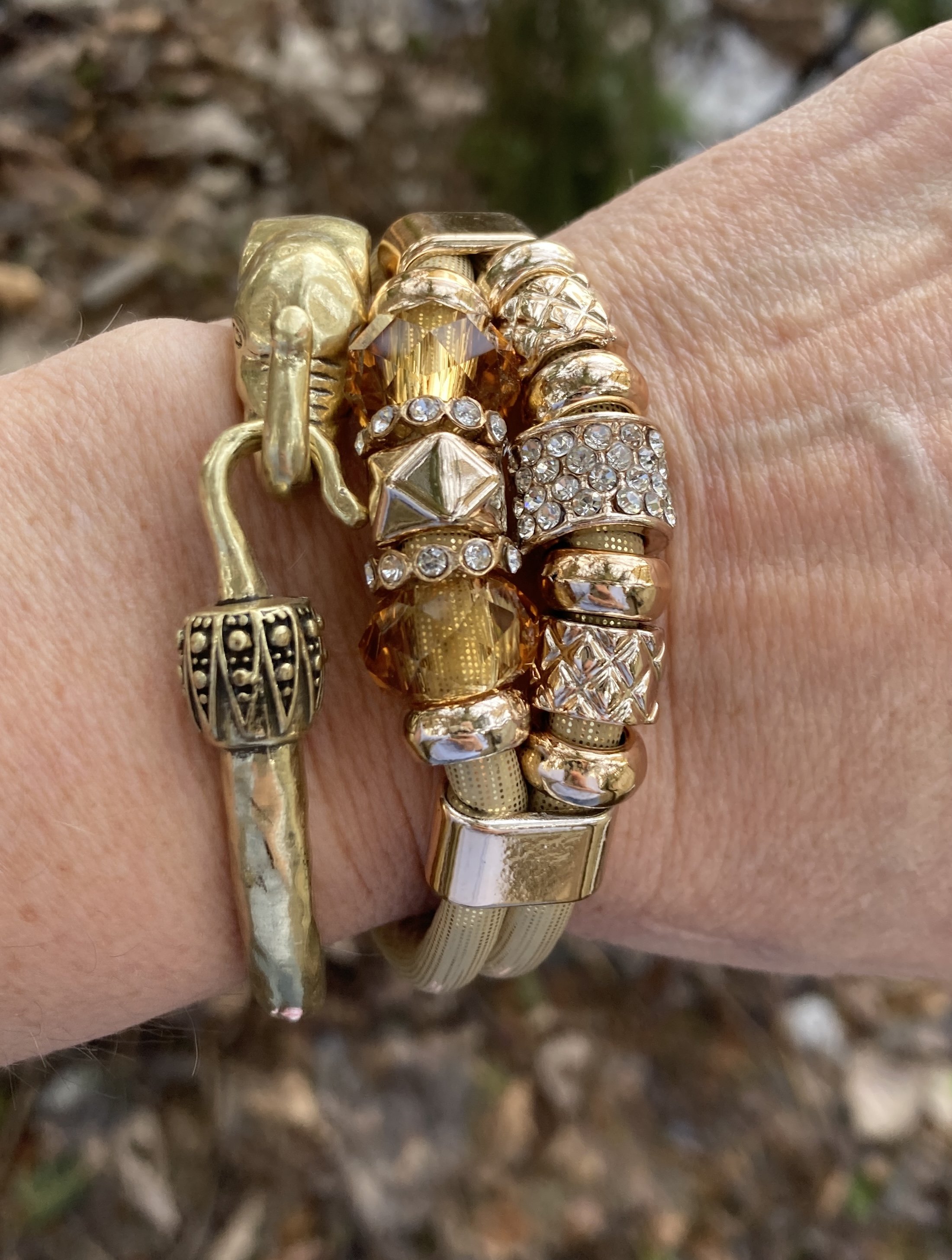I chose gold for my jewelry and everything except the elephant bracelet is second hand. The elephant bracelet was a gift from my oldest daughter a few years ago.