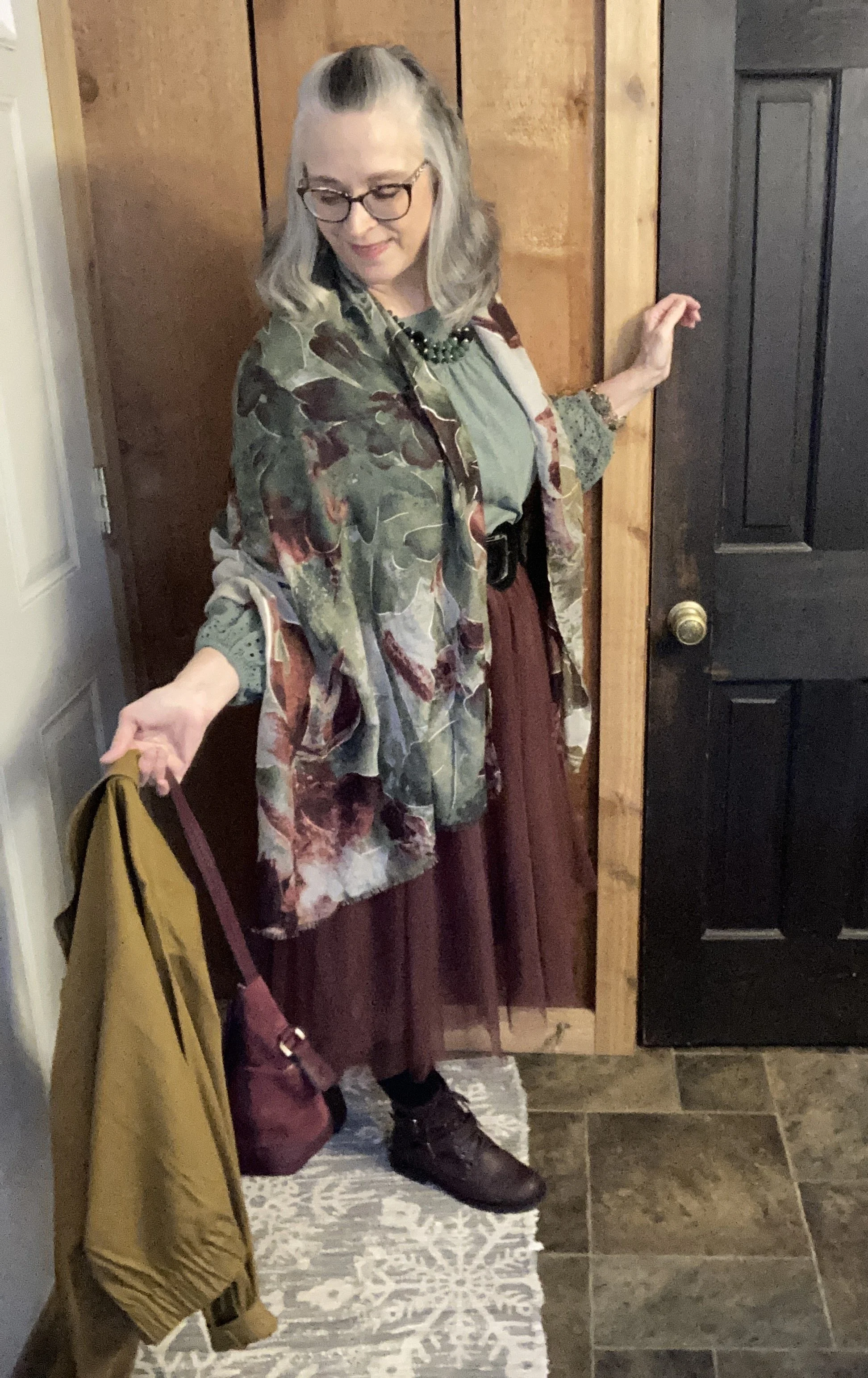 The beauty of wearing a larger scarf like this is if you decide to take off the jacket you can use the scarf as a shawl.