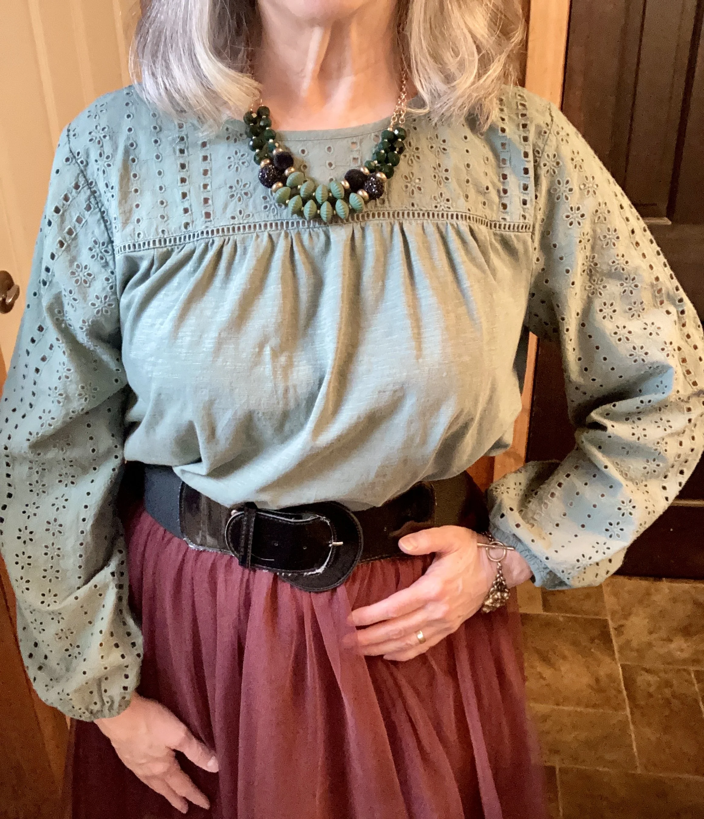 After the skirt came the top. This was thrifted this past year. Just like embroidery, I am a sucker for eyelet, so the yoke and sleeves grabbed my attention right away. This is St. John’s Bay brand. The body of the top is jersey knit so a comfortable tee type material.