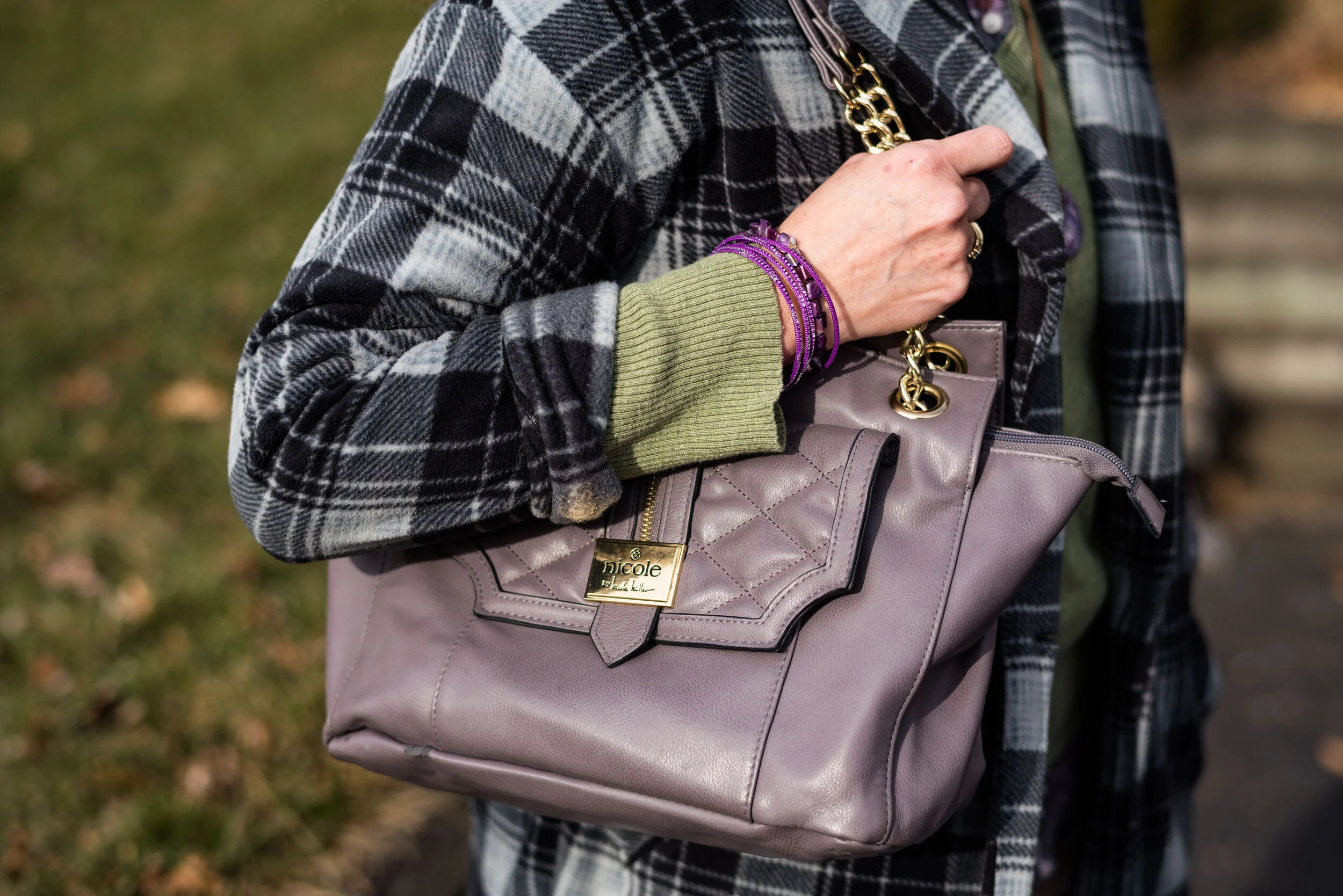 Accessories included a simply handmade bead necklace, purple bangle bracelets. and a Nicole tote bag. I love the purply gray color of this purse. The gold accents make it look high class.