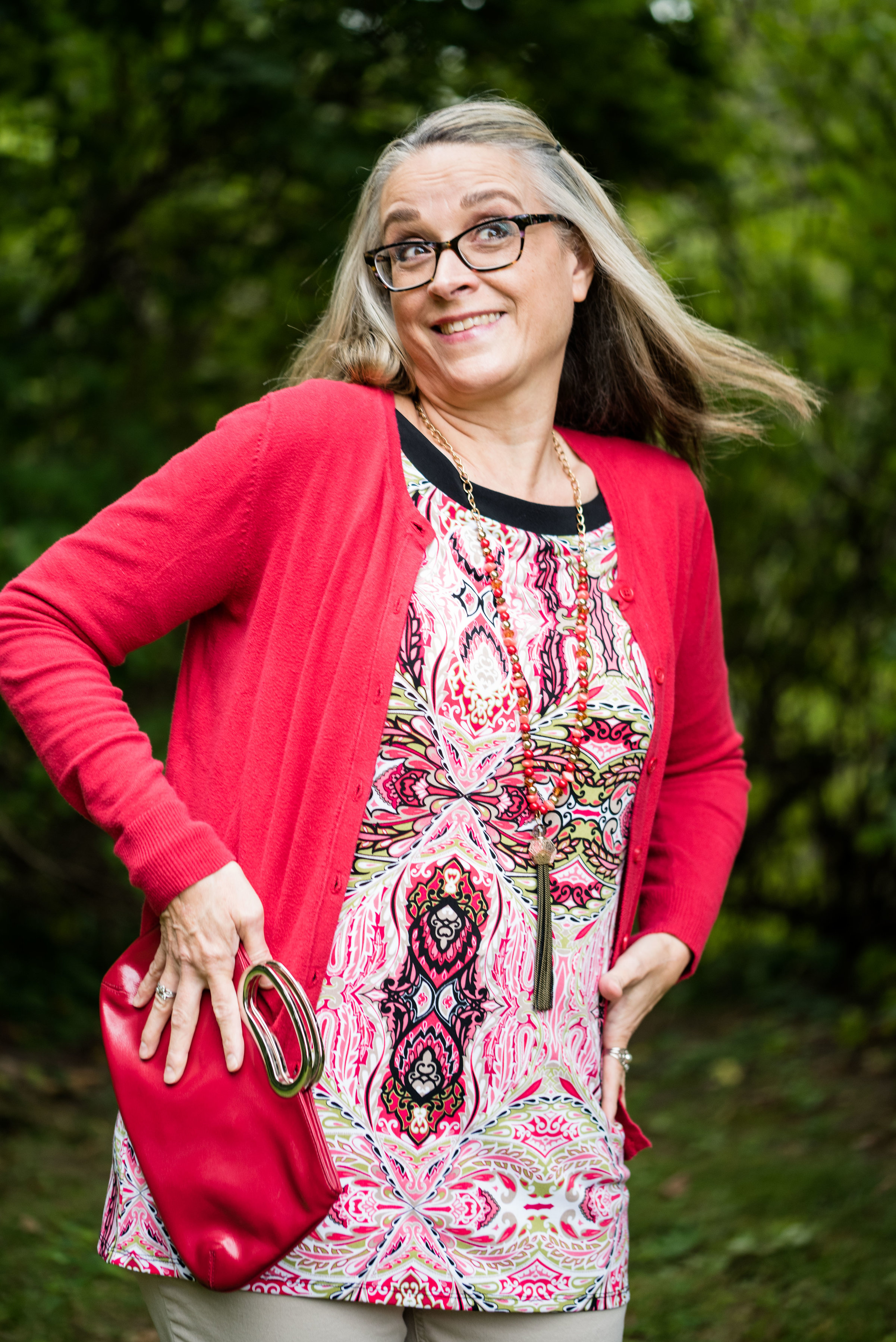 Welcome back to outfit number three in this fall’s Pantone color series. Today I am featuring two colors which the Pantone site describes as a “bright and bold dramatic pink” and a “brave and outgoing red.” I didn’t go into this series thinking I would pair these two colors, but when I started looking for the pink and decided on this multi-print tunic, it was only natural to choose another color in the tunic to pair with it, which obviously turned out to be red. I have always thought of pairing red and pink as a Valentine’s Day idea, but when I began putting this outfit together, I saw a subtle shift from cupids and hearts to fall apples and fuzzy pink slippers.