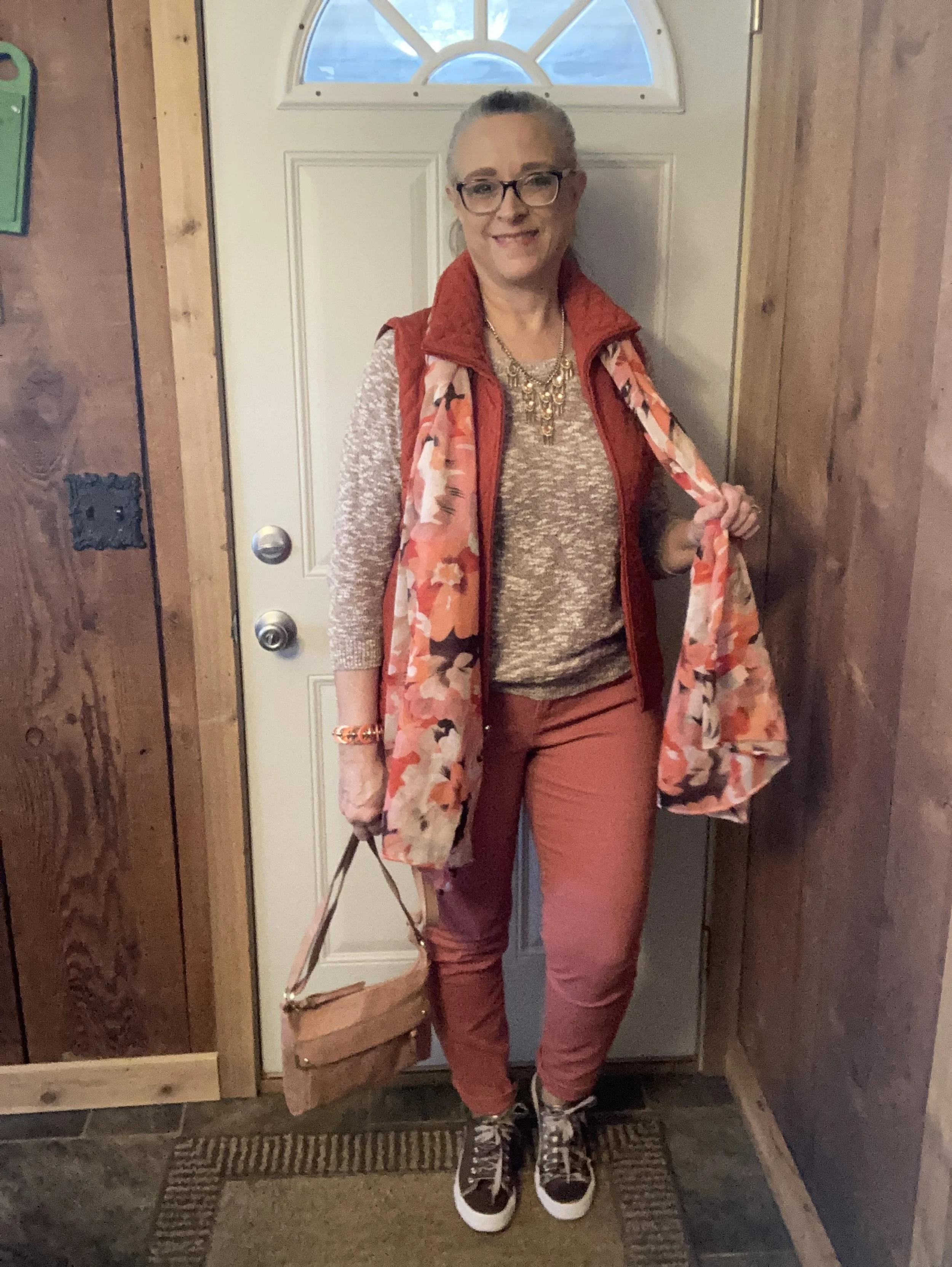 You can also see in the above picture my thrifted Old Navy sweater top. I had a Machiotto colored jean jacket picked out, but I didn’t have any other orange that worked as well as my vest. Even though there is a distinct marled print you can see the brown color throughout.
