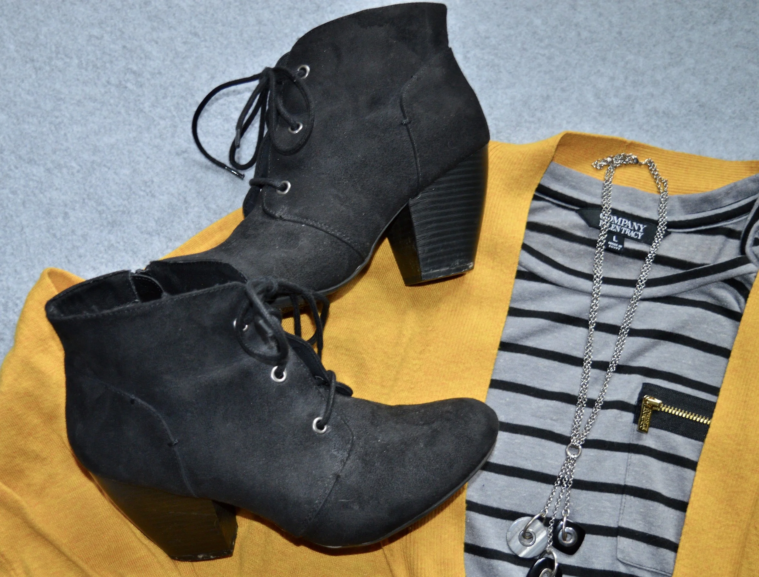 I tried on several pairs of boots and ended up choosing my Nine West brown suede boots, also from Kohl’s a couple of years ago. I wish I would have tried on my burgundy ankle boots, because they might have looked just a tiny bit better.