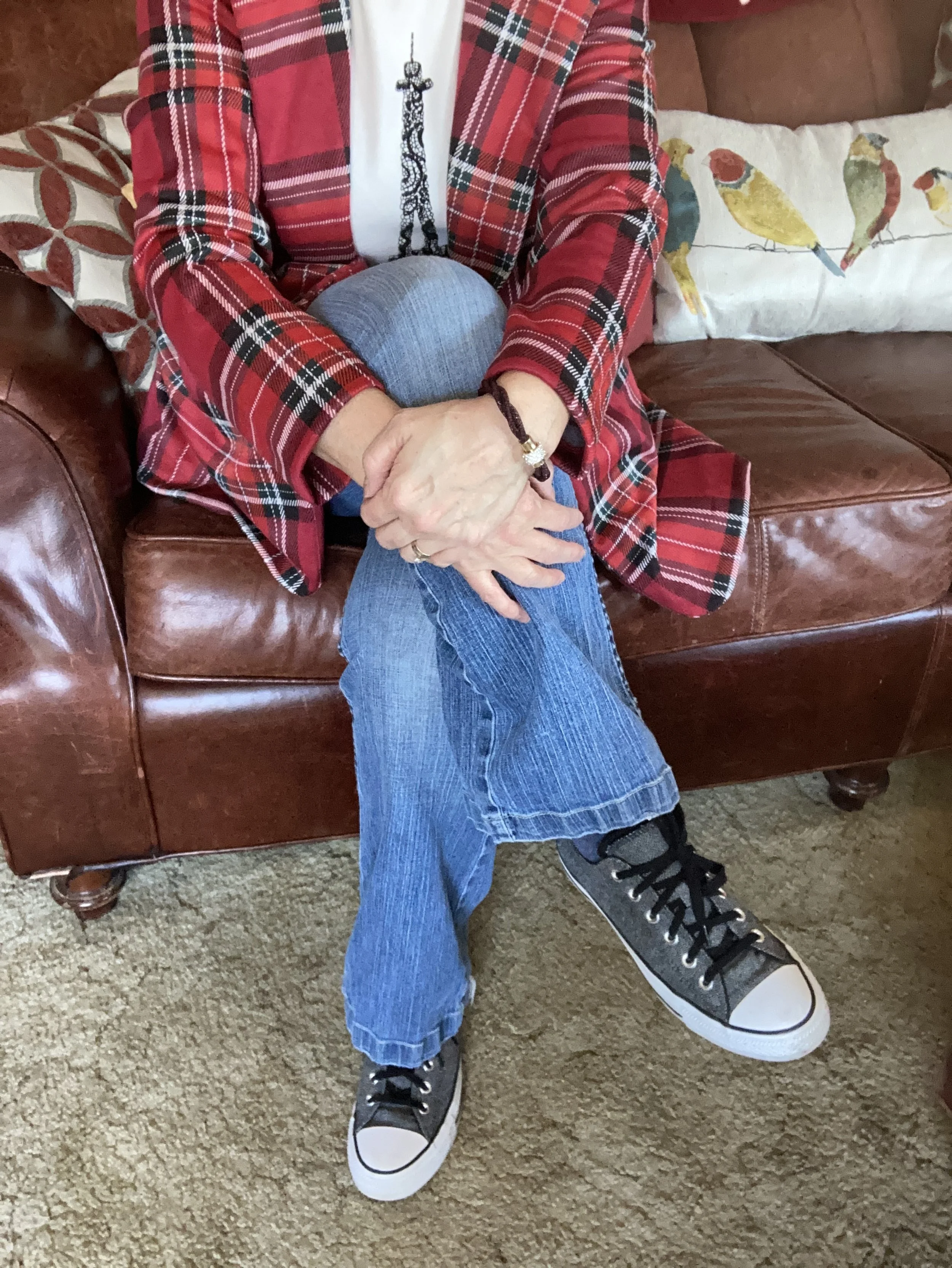 Once I chose this tee, I knew I wanted something red plaid as a topper. I am also wearing a thrifted long sleeve tee under the tee for extra warmth. I thought about one of my two red plaid blazers, but decided the red and black checked button down a better choice for the casual vibes. Buffalo plaid, which is a larger checked plaid, is always popular at Christmas, so I thought this worked well. This piece is thrifted Old Navy brand.