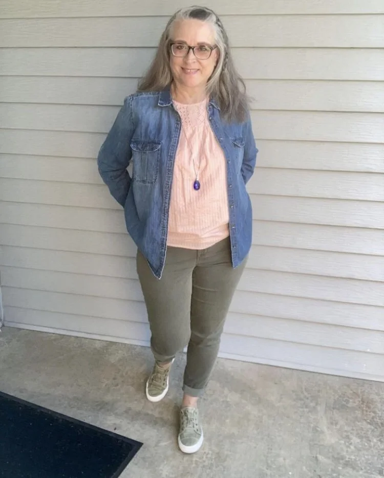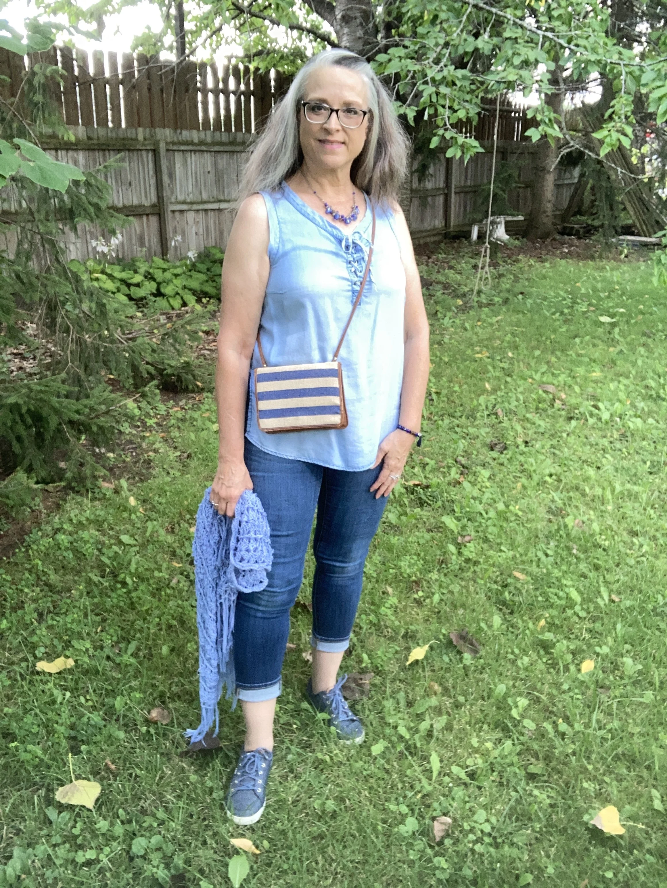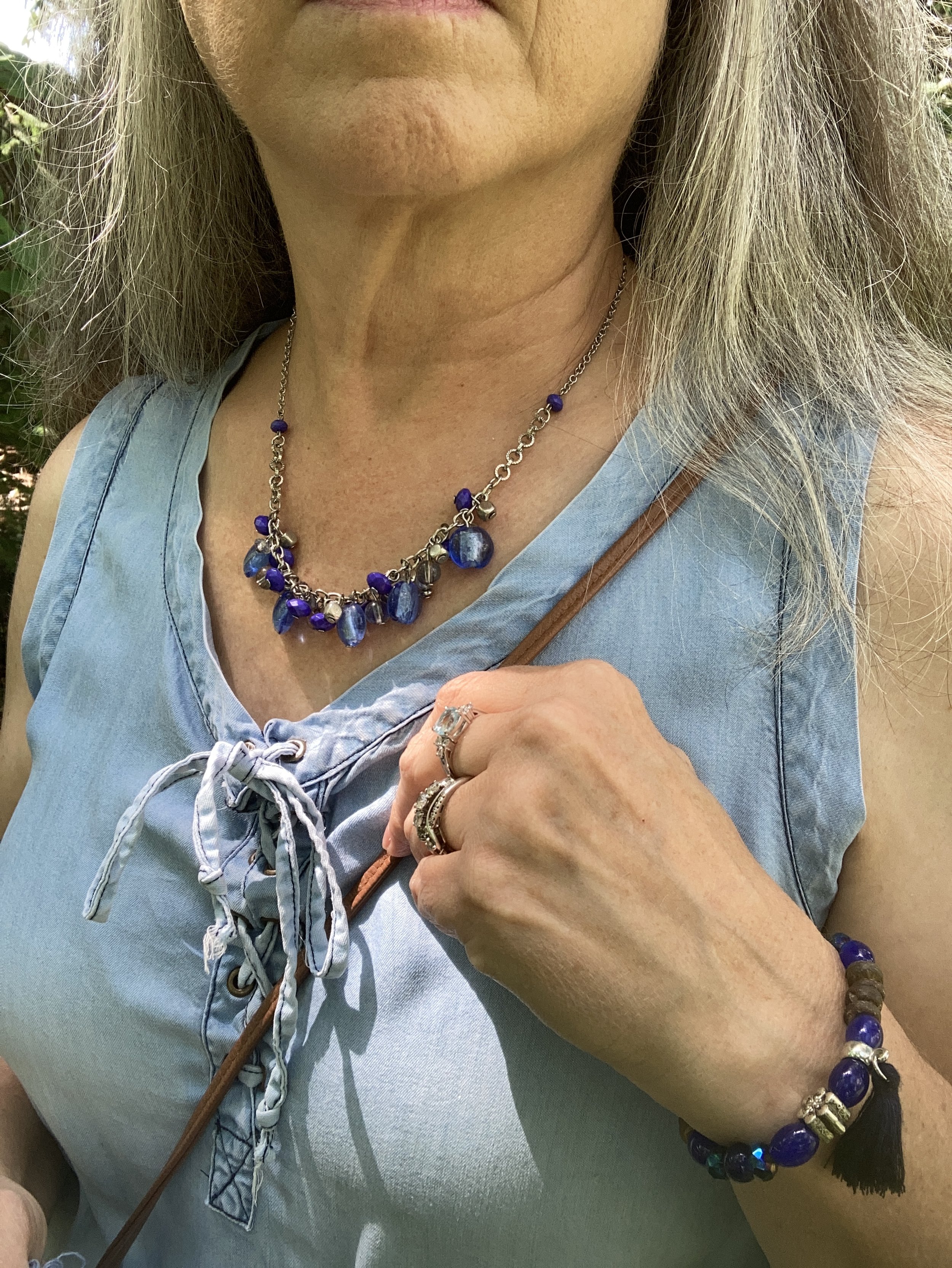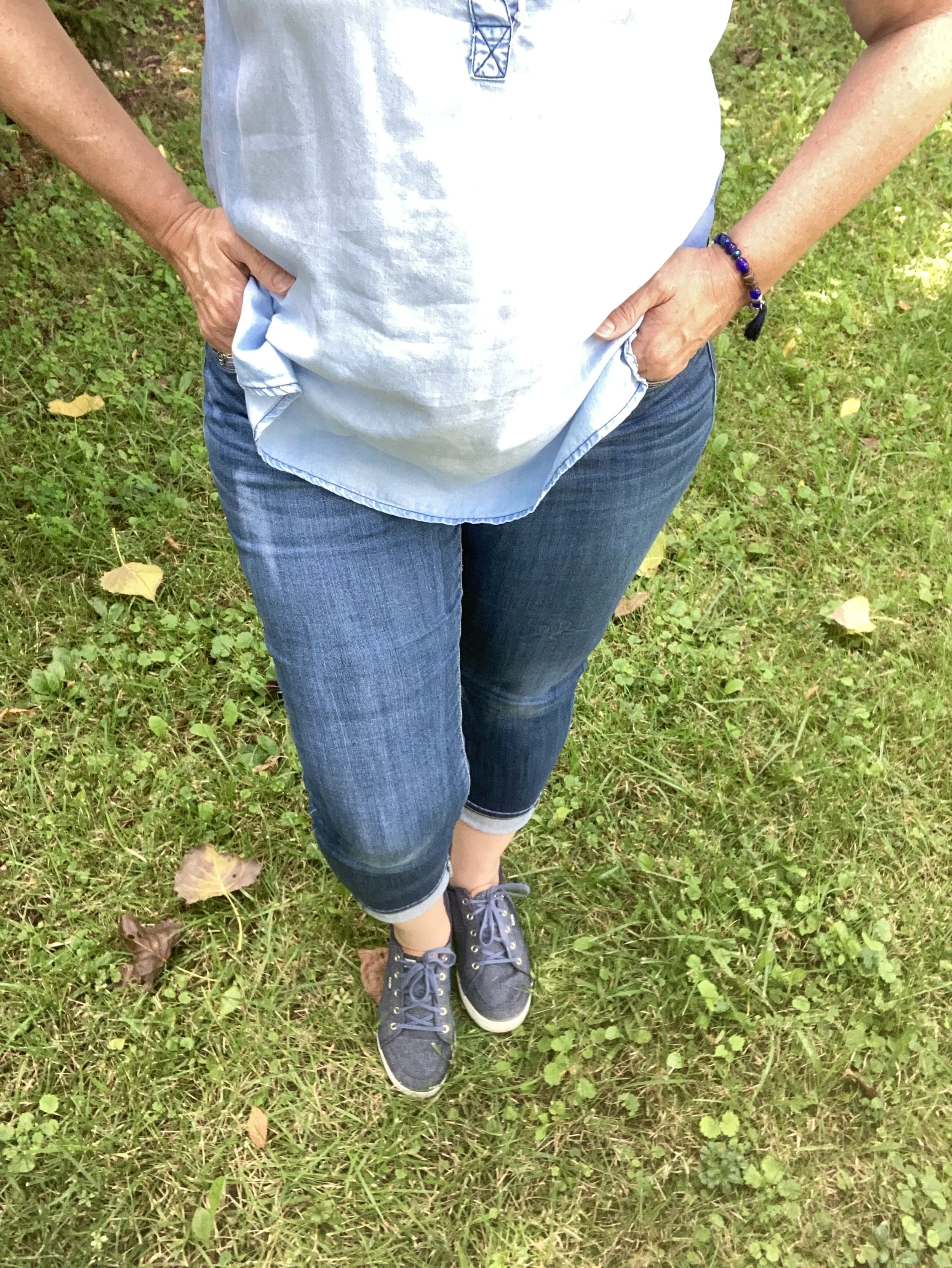 You can see my jewelry in the above picture. I love the layer necklaces and there is no reason to think they have to match. I did think the gold ribbon on the multicolored bead, and the gold chain went well together. Both pieces pulled in the black Chaps espadrille shoes. I got these at Kohl’s a few years ago.