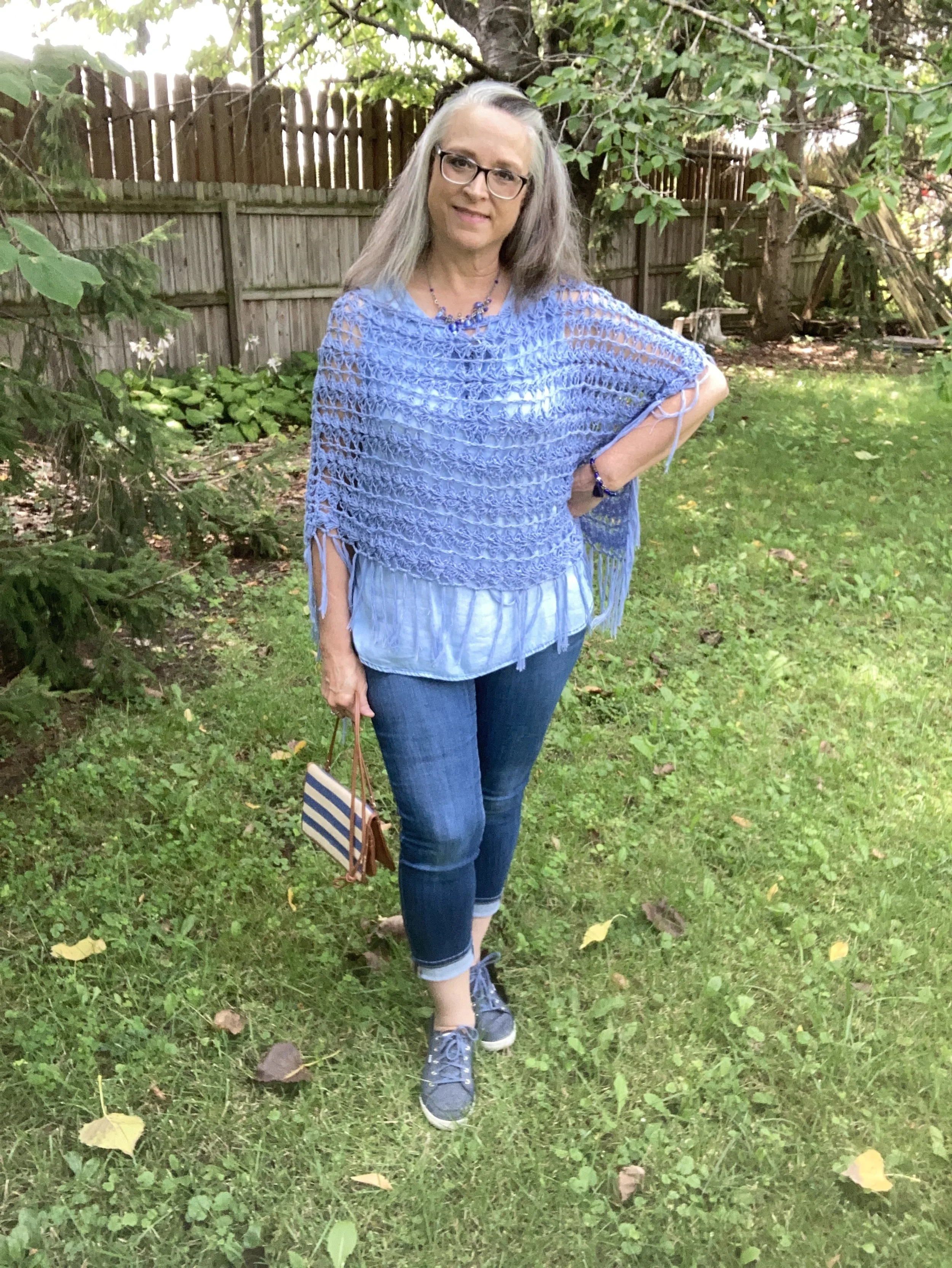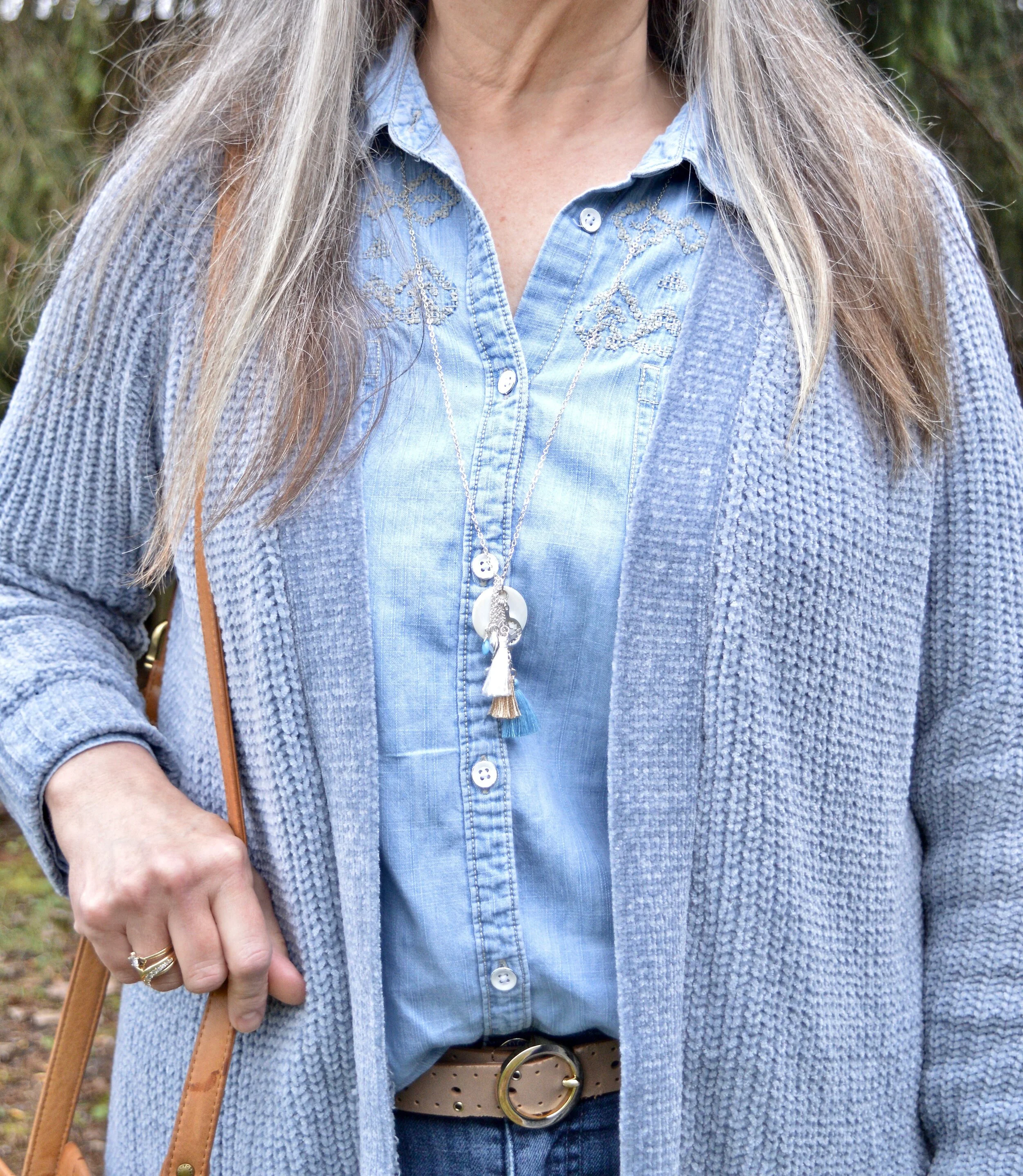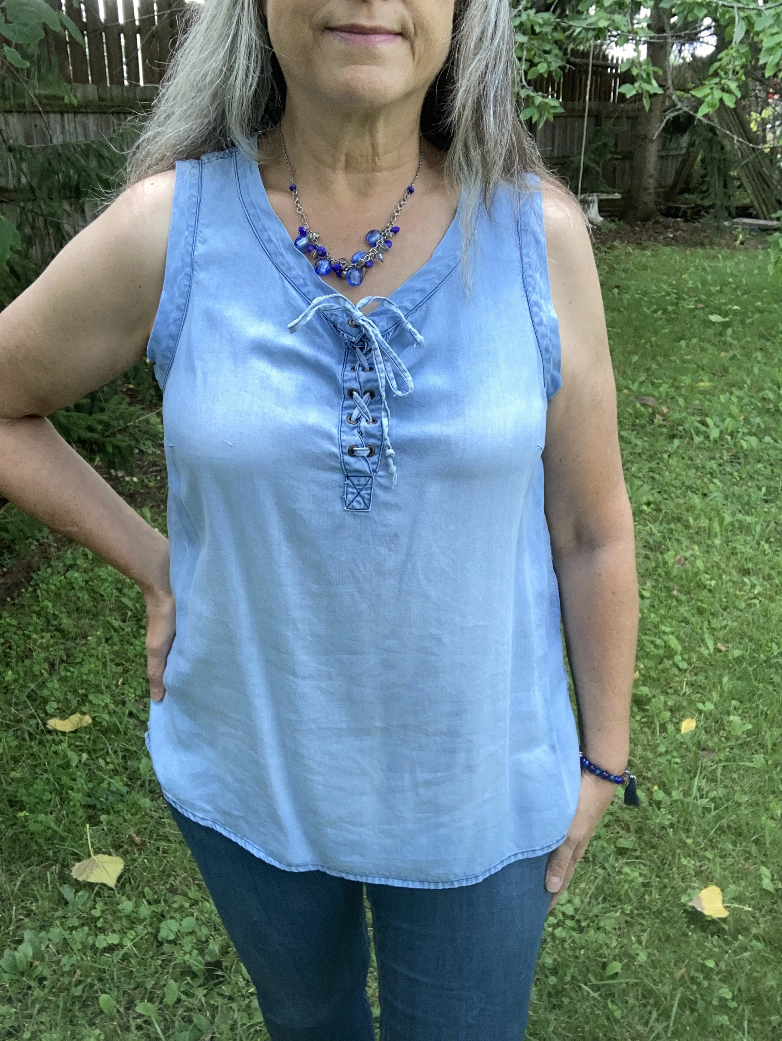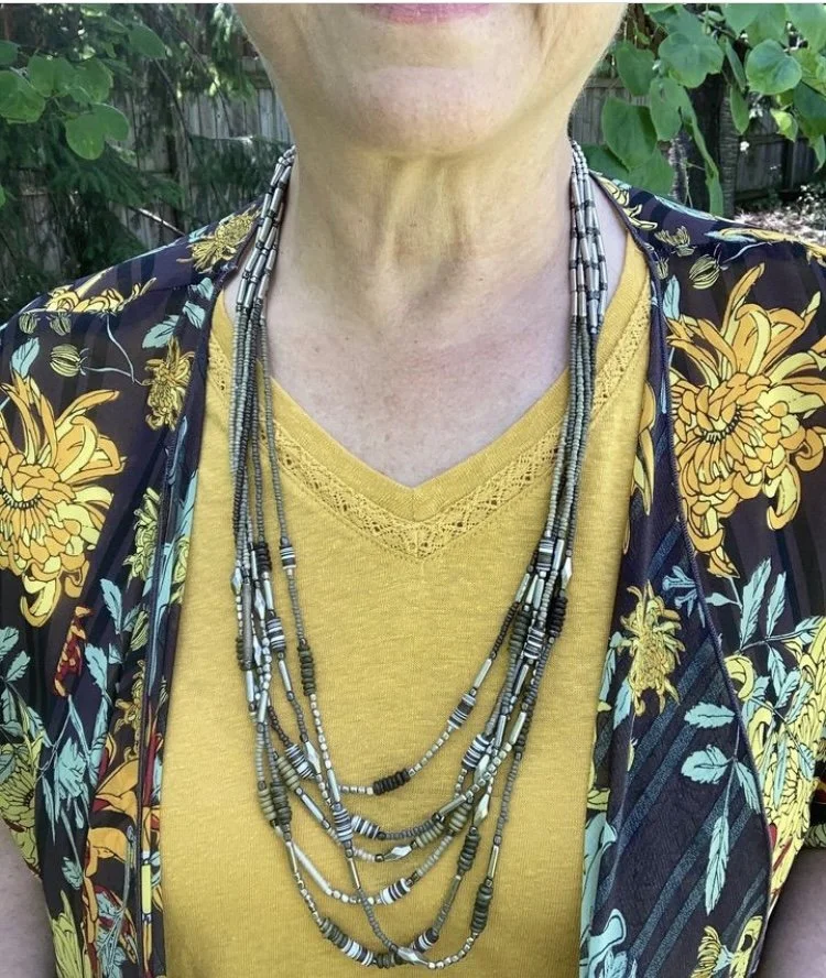 You can see my jewelry in the above picture. I love the layer necklaces and there is no reason to think they have to match. I did think the gold ribbon on the multicolored bead, and the gold chain went well together. Both pieces pulled in the black Chaps espadrille shoes. I got these at Kohl’s a few years ago.