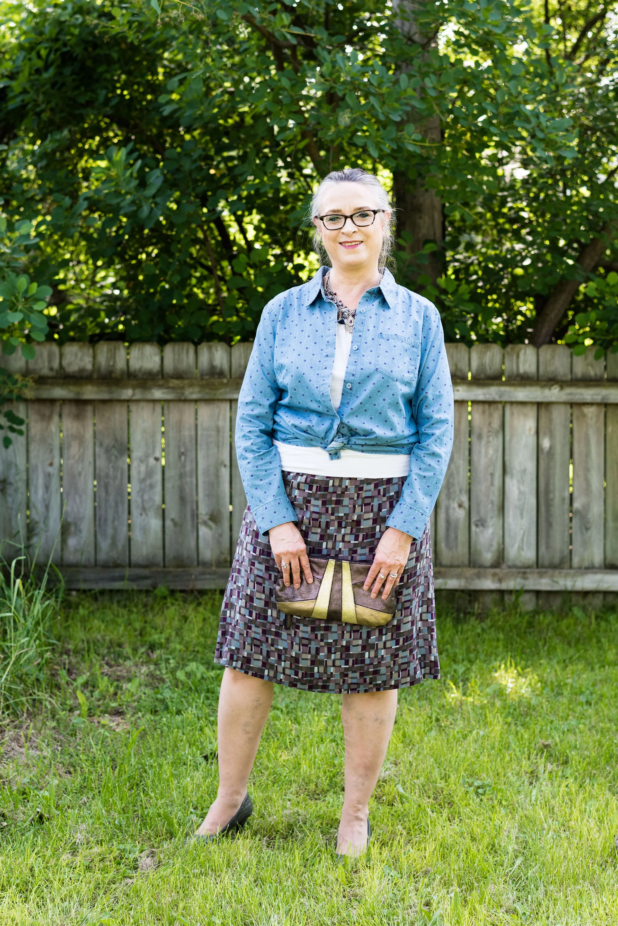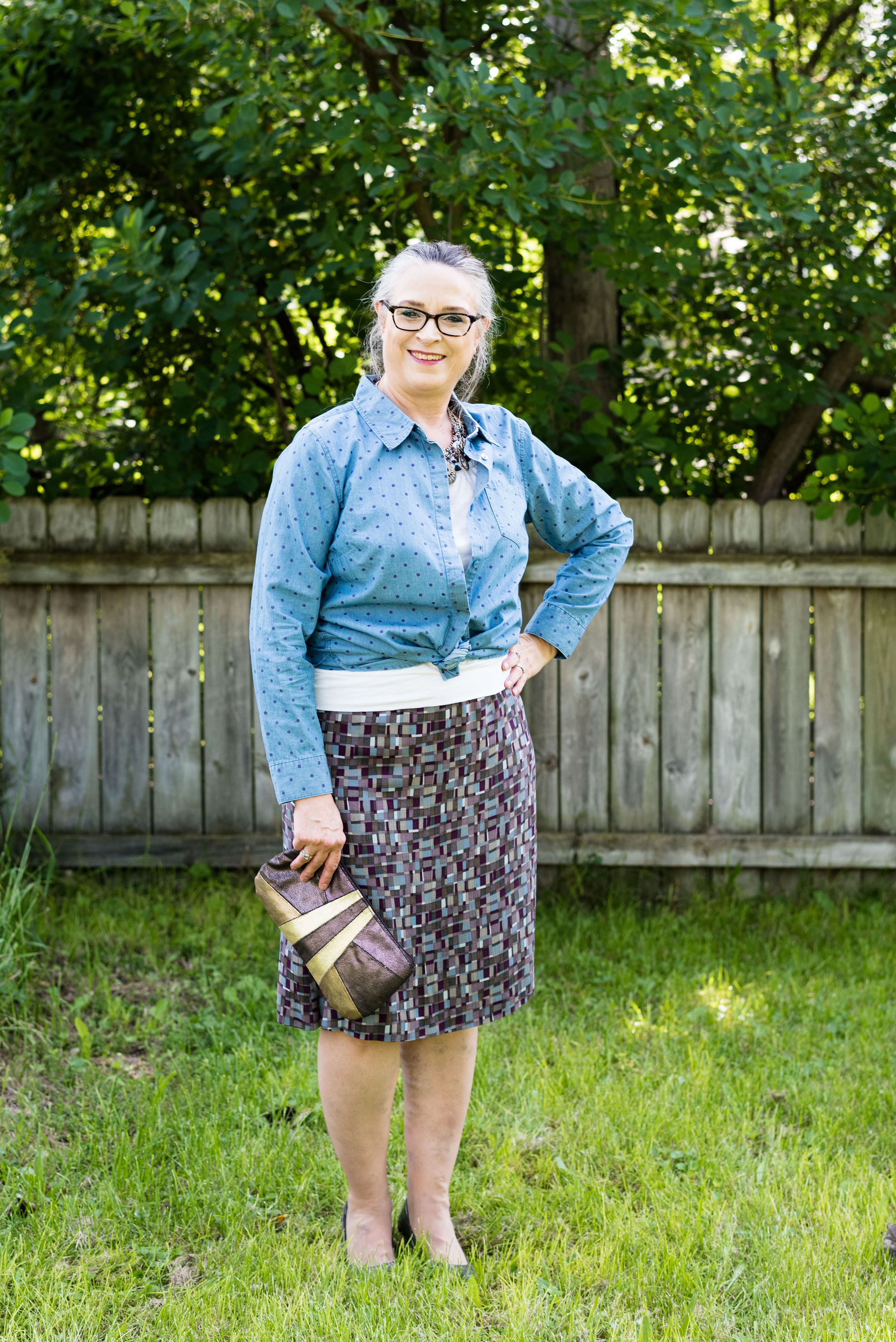 I have styled this skirt on the blog one other time since I thrifted it a couple years ago. I have no idea what the brand is, but I love the asymmetrical hem, the ruffle and the buttons off to the side. You can see how I styled it for the 4th of July last year.