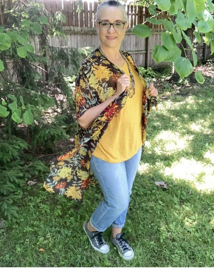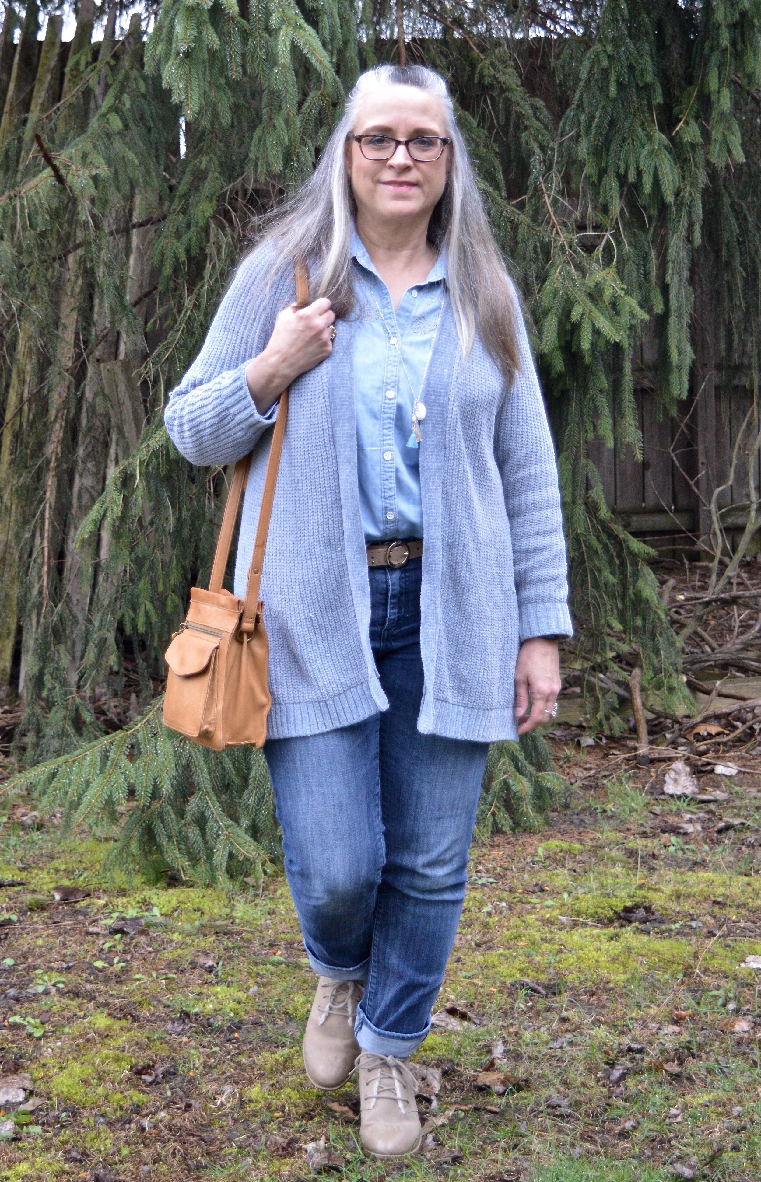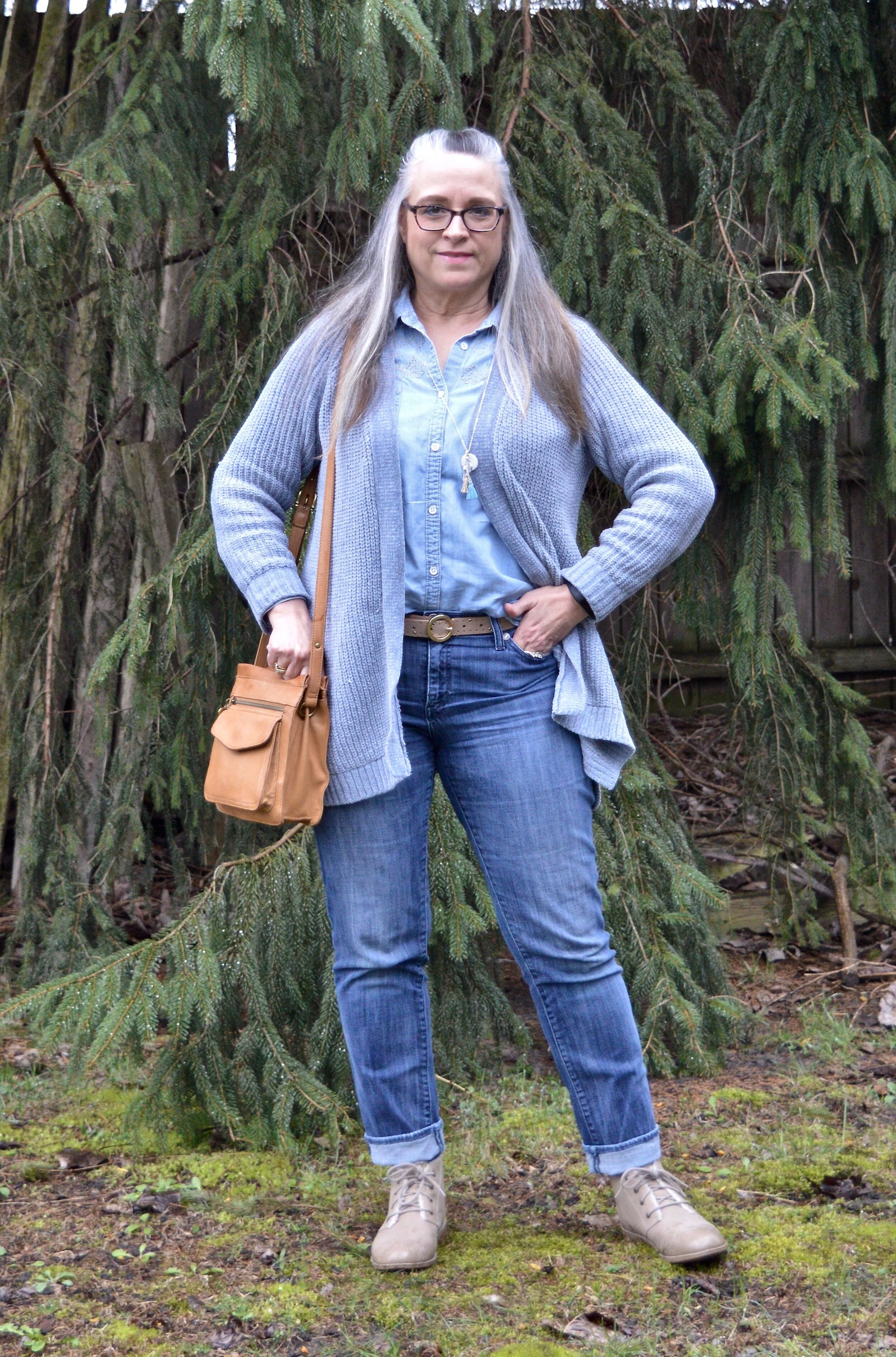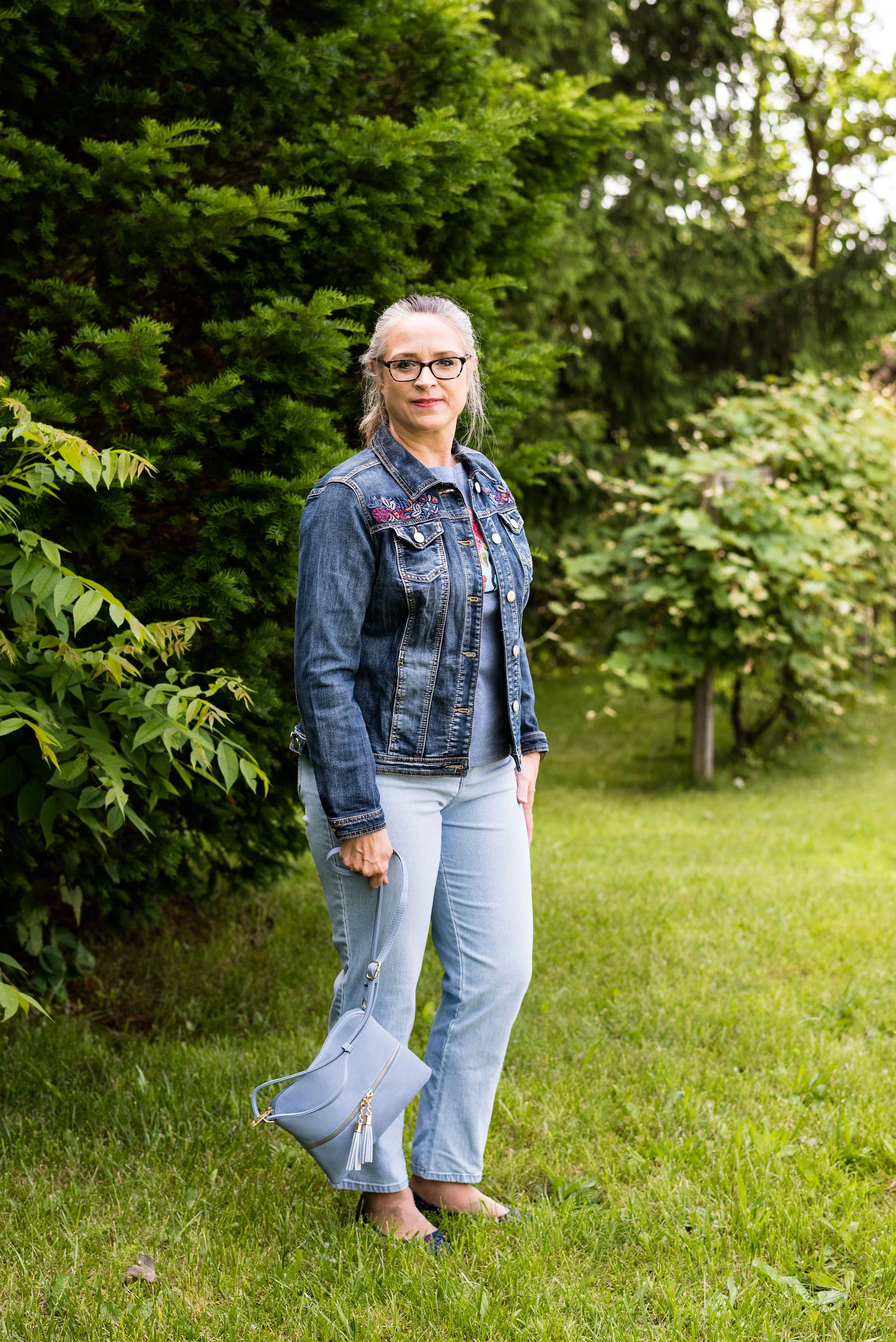 I once again styled it with a white tee, and denim, but this time chose a classic crew neck, thrifted Great Northwest brand, and my 3/4 length sleeve thrifted Rue 21 cropped denim jacket.
