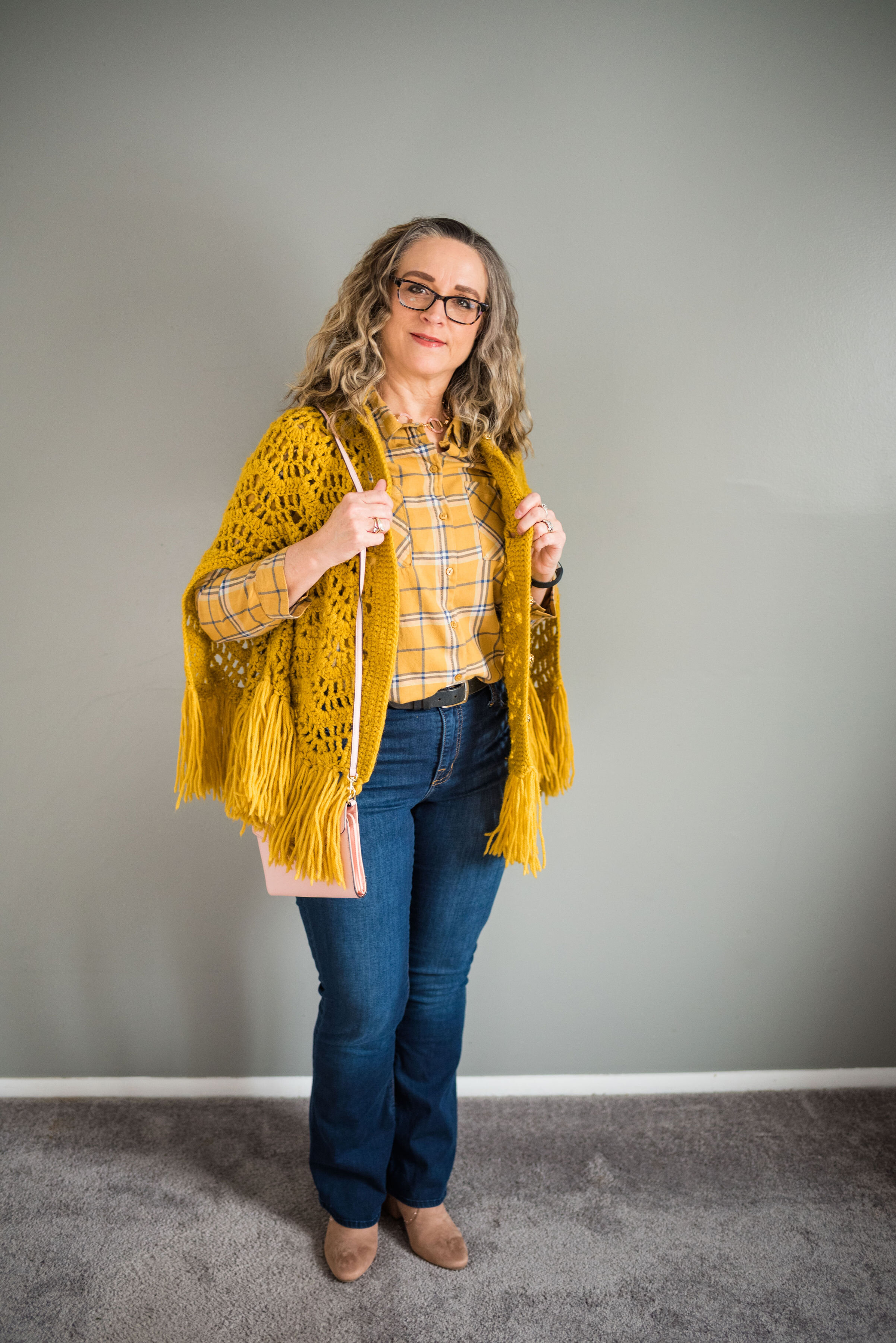 For this look, I started with the plaid, flannel shirt. It is a men’s Croft & Barrow shirt from Kohl’s. It actually belonged to my hubby, but he never wore it, so I confiscated it. Ha, ha. I love flannel, oversized shirts and while this one is not very feminine, I enjoyed the challenge of making it into a more feminine look by adding the skirt. The shirt has both the dark, earthy brown and the dark blue, so it seemed perfect for the look I was trying to achieve. I also added the silver and brown beaded necklace for a little extra femininity.