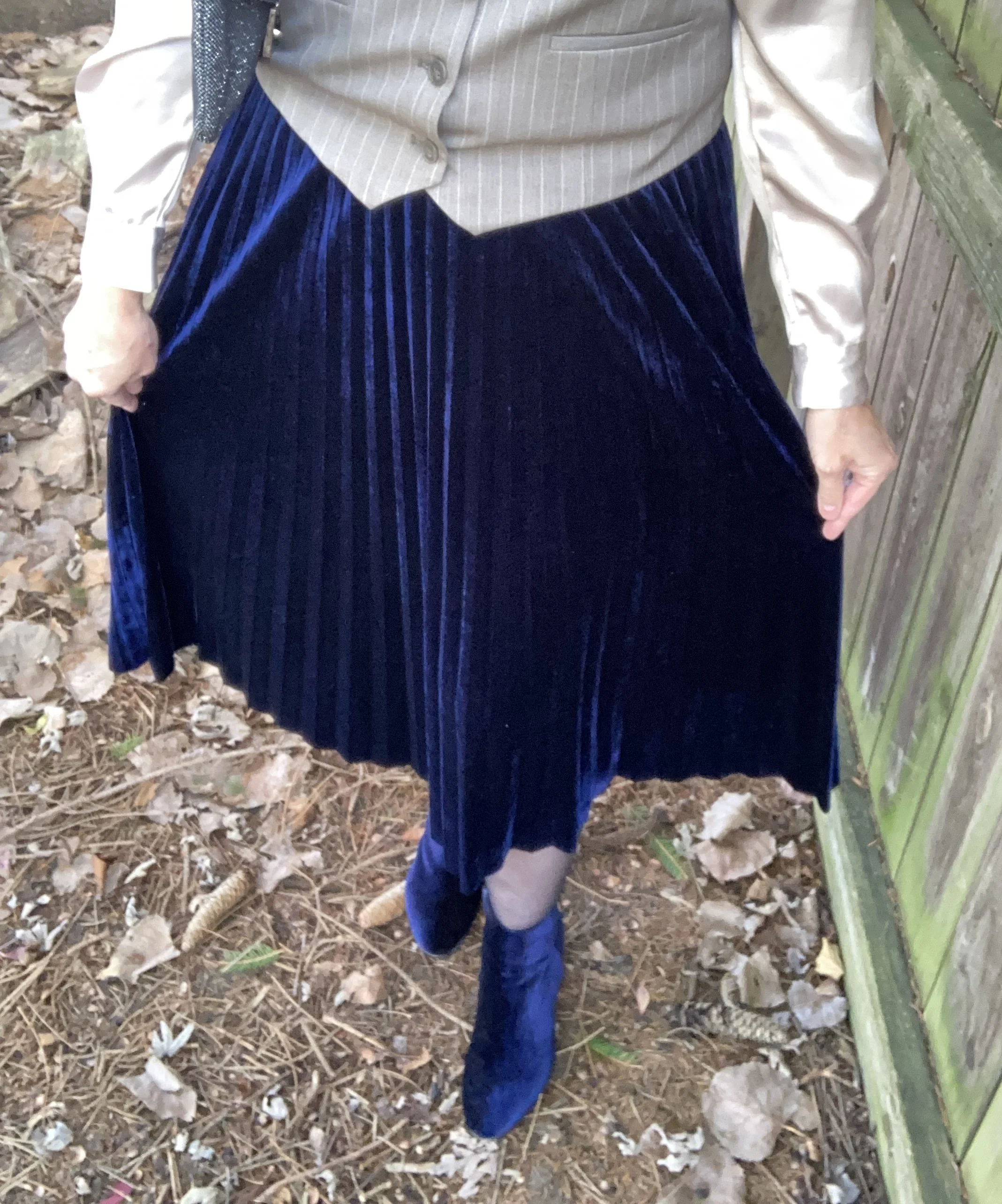 I assured him any color can be worn with any other color and it also served as the inspiration for today’s outfit. I already had the blouse on, as I was using it as part of my Instagram outfit. It is one of the dressiest blouses I own. With that beginning I began looking through my skirts and settled on this beautiful navy, velvet piece with pleats. This was a Kohl’s clearance purchase a few year ago and is Chaps brand.