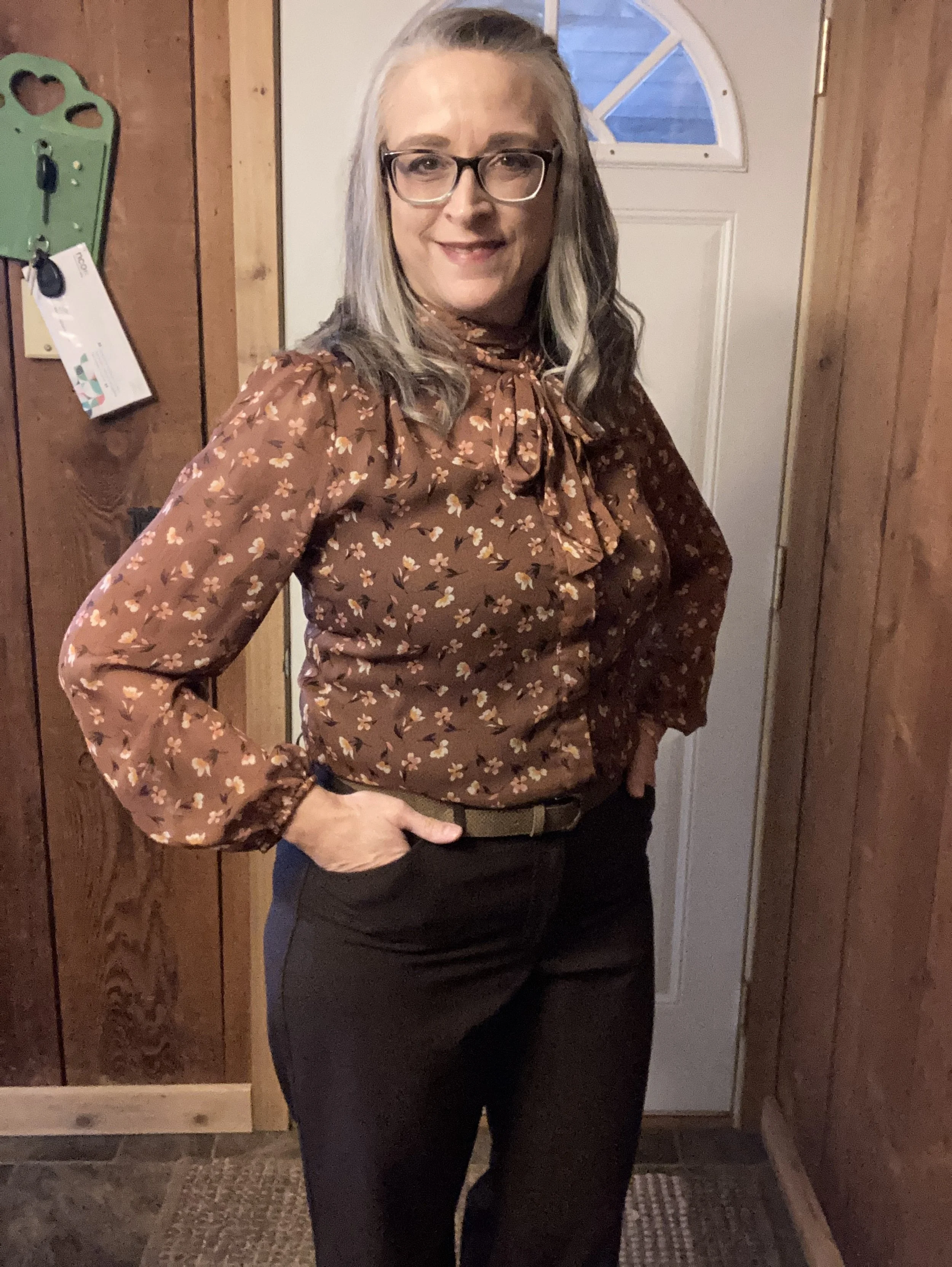 I didn’t have a lot of time to work through the details on some of these outfits. My tunic blouse was a little tight around the bum. I probably should have tucked it in or tried a different approach, like a black turtleneck or long sleeved tee. Oh well, that just shows my authenticity. Nothing fake going on here. Ha, ha.