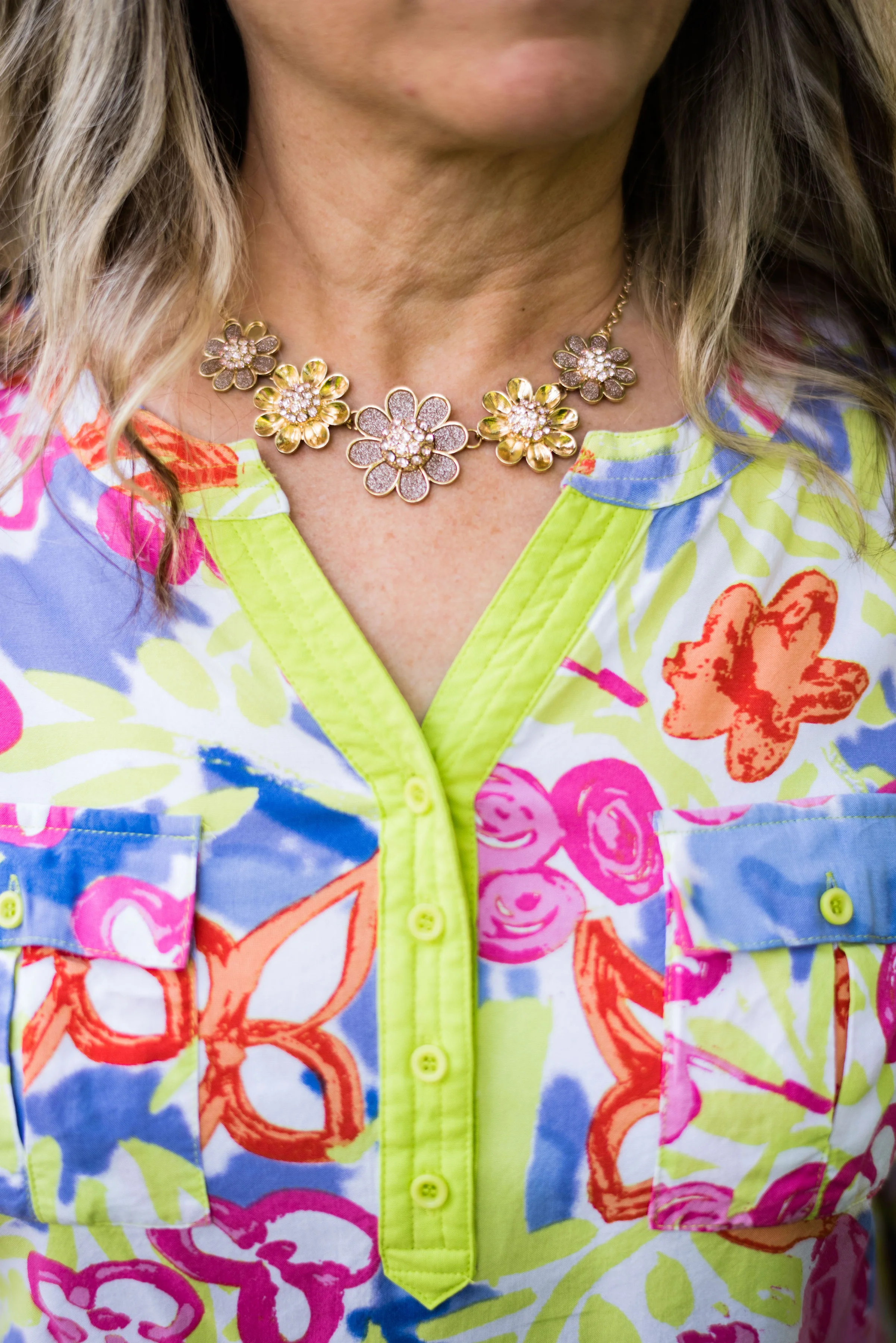 I chose gold for my accessories. The floral necklace has a bit of a purple hue, which is also why I chose the bag and the sandals I did. It is always fun to me, when all my accessories come together. I know it is not necessary to have our accessories match, but I still think it is fun to do, once in a while.