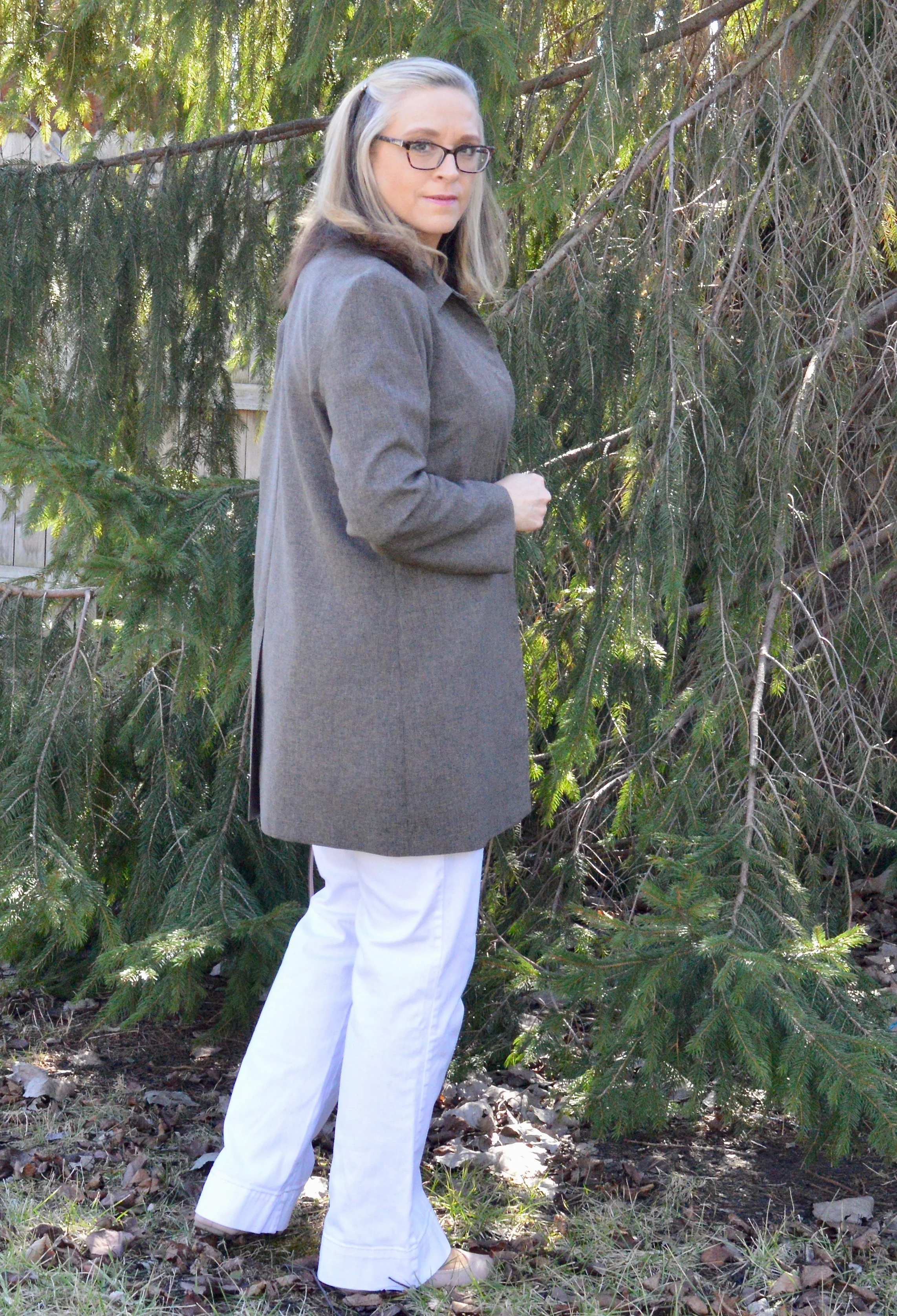This week, I looked at my many jackets, blazers and other such pieces and decided to build an outfit using this suit wear jacket. Longer than a regular blazer this light weight piece is rather dull. The reason I bought it at a thrift store is that I thought it would be a versatile piece. I have worn it once or twice to work, but other than that don't often reach for it.