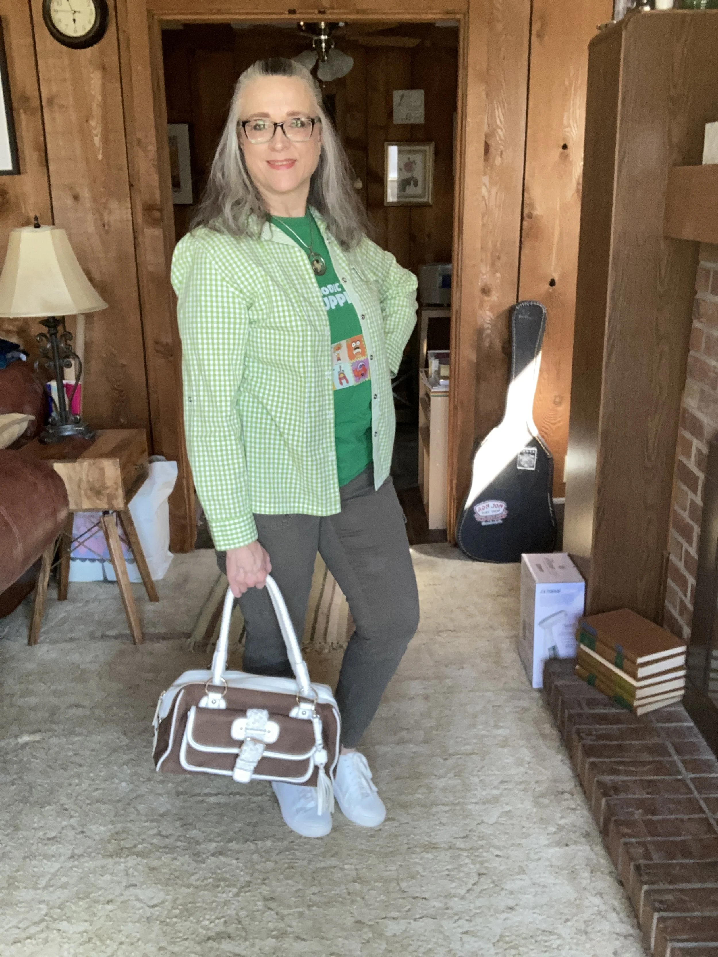 This brown and white bag was a thrifting treasure. It is Rafe NY brand. I really like the style and roominess of the this bag. The fringe tassel and woven buckle strap on the front pocket add such fun details. The bag is a bit heavy, so I won’t be using it for any long shopping trips, but it will make a great travel bag with room for a book and a few snacks. Ha, ha. I felt it went very well with the whole vibe of this outfit. What do you think?