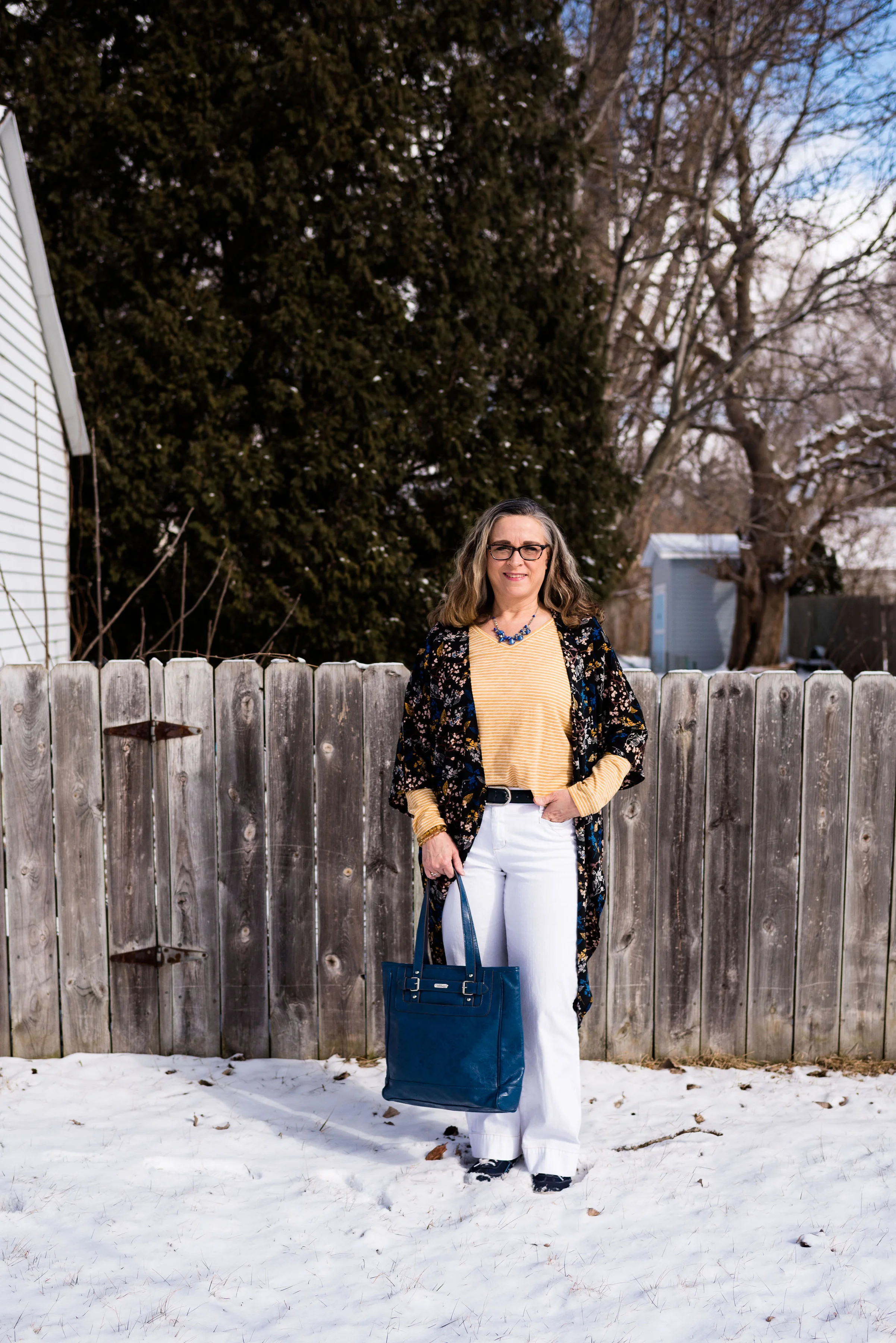 These polka dot Gloria Vanderbilt jeans were in a box to donate, but since I lost a little bit of weight, I decided to revisit the boxes that I hadn’t dealt with yet, trying everything on and setting aside things I still wanted to hang on to. I don’t wear these often, but I do like them as an alternative from regular blue denim. Plus with the polka dots it makes them a good choice for a print mix like this. You can see I folded the hems a few times to give them more the appearance of cropped pants.