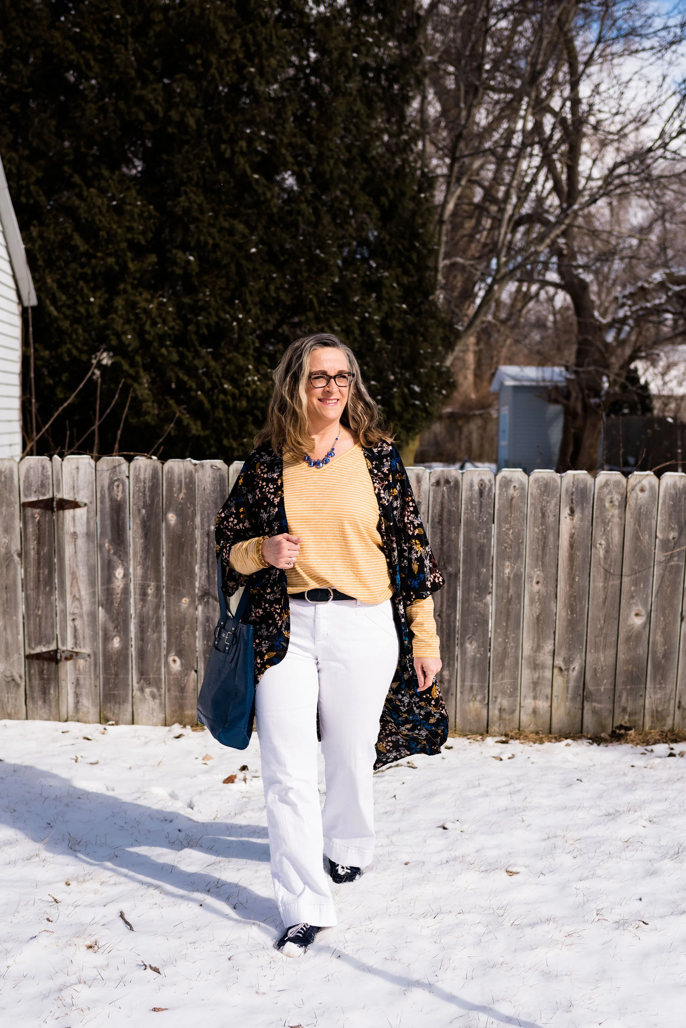 You could easily replicate this look by using a color of your choosing for the striped tee and then picking a piece with a complimentary color for the kimono or even a floral cardigan or bomber jacket. It’s not that you create an outfit that looks just like mine, but that you find things in your own closet that will give you a similar look. You wouldn’t have to wear white jeans. Any wash of denim would look cute with a print mix like this or pick out another color that goes with one of the other colors in your print pieces. For instance, my kimono also contains brown and is on a black background. Either color could have worked for my bottom piece.