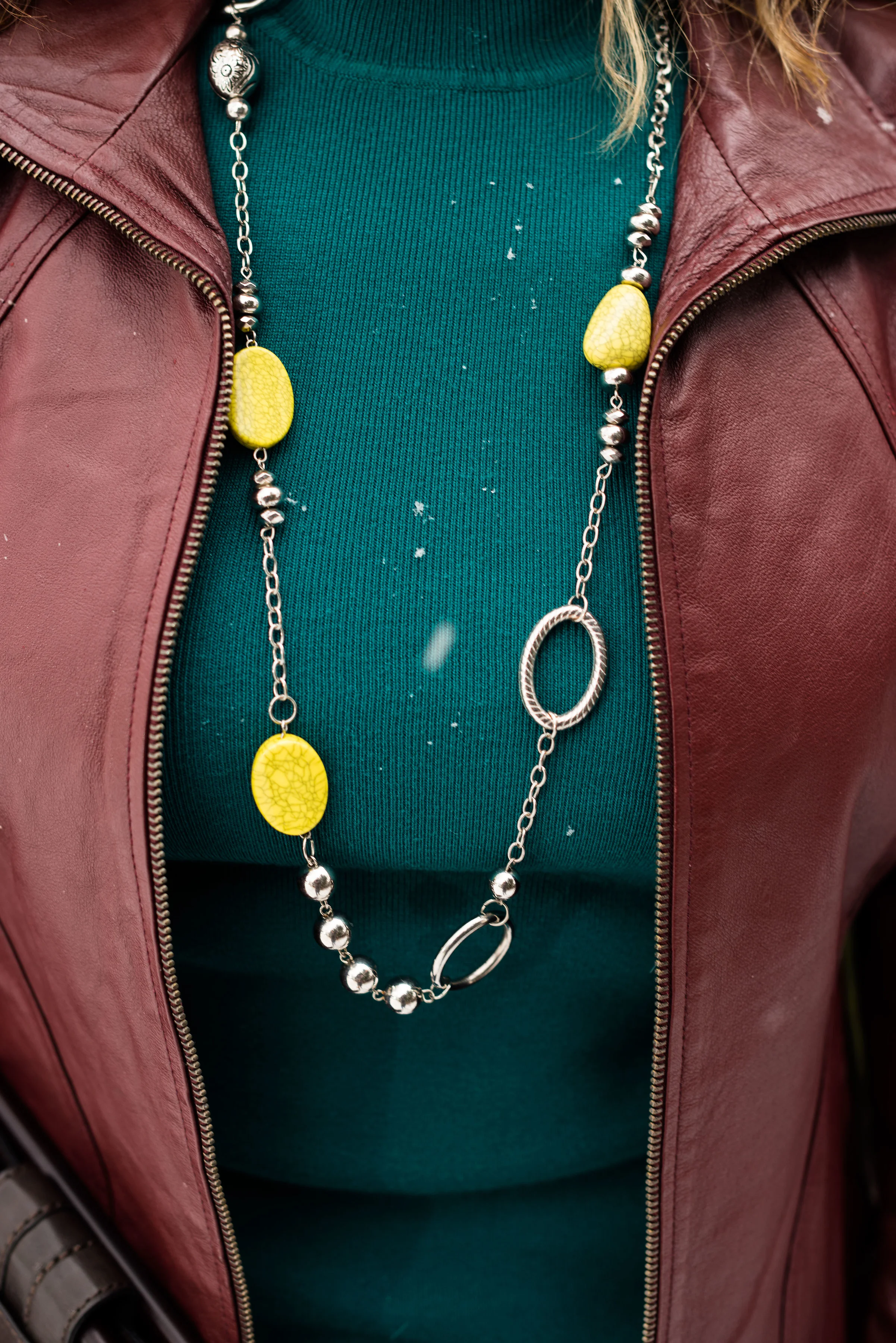 My Pop Sugar red smocked blouse was from Kohl’s a few seasons ago. It has ruffle details along the sleeve openings, but is otherwise sleeveless. I love the smocking detail and the shiny fabric. Check out these tops from Shein, Dia & Co, and JC Penney. You can also see in the photo below my long pendant necklace and belt. I have a beaded bracelet on as well that mimics the Basil green color, but it is mostly hidden by my sleeve. Ha, ha.