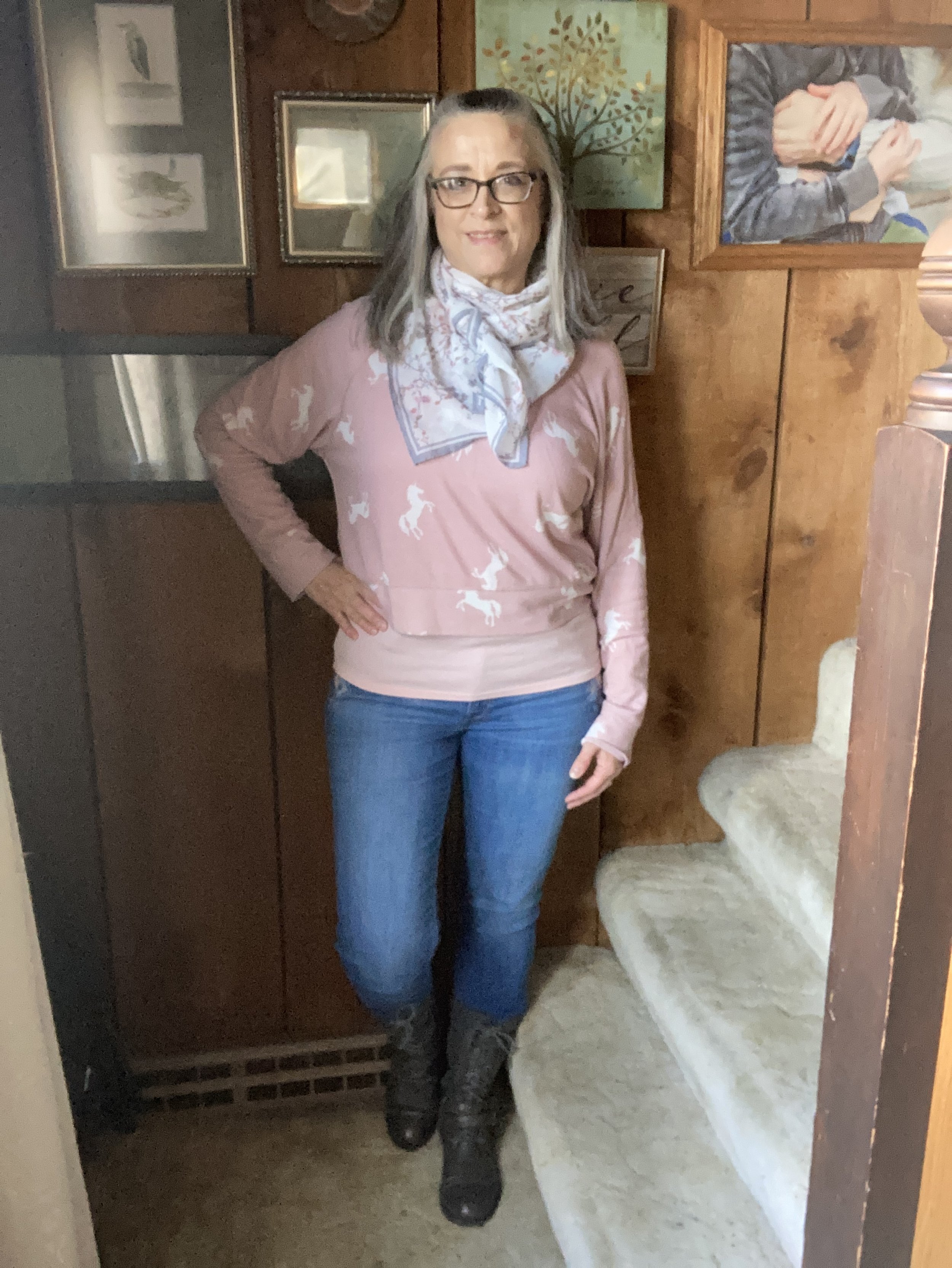 Unicorns are the stuff of fairy tales. I am less about the one horned wonder and more about regular horses with insight into their master’s whims and thoughts…think Gandalf’s horse Shadowfax from Lord of the Rings. Still, I could not resist this sweater, since I am a sucker for fairy tales and all things fantastical. Because the top is short, I added a long sleeve pink tee underneath.