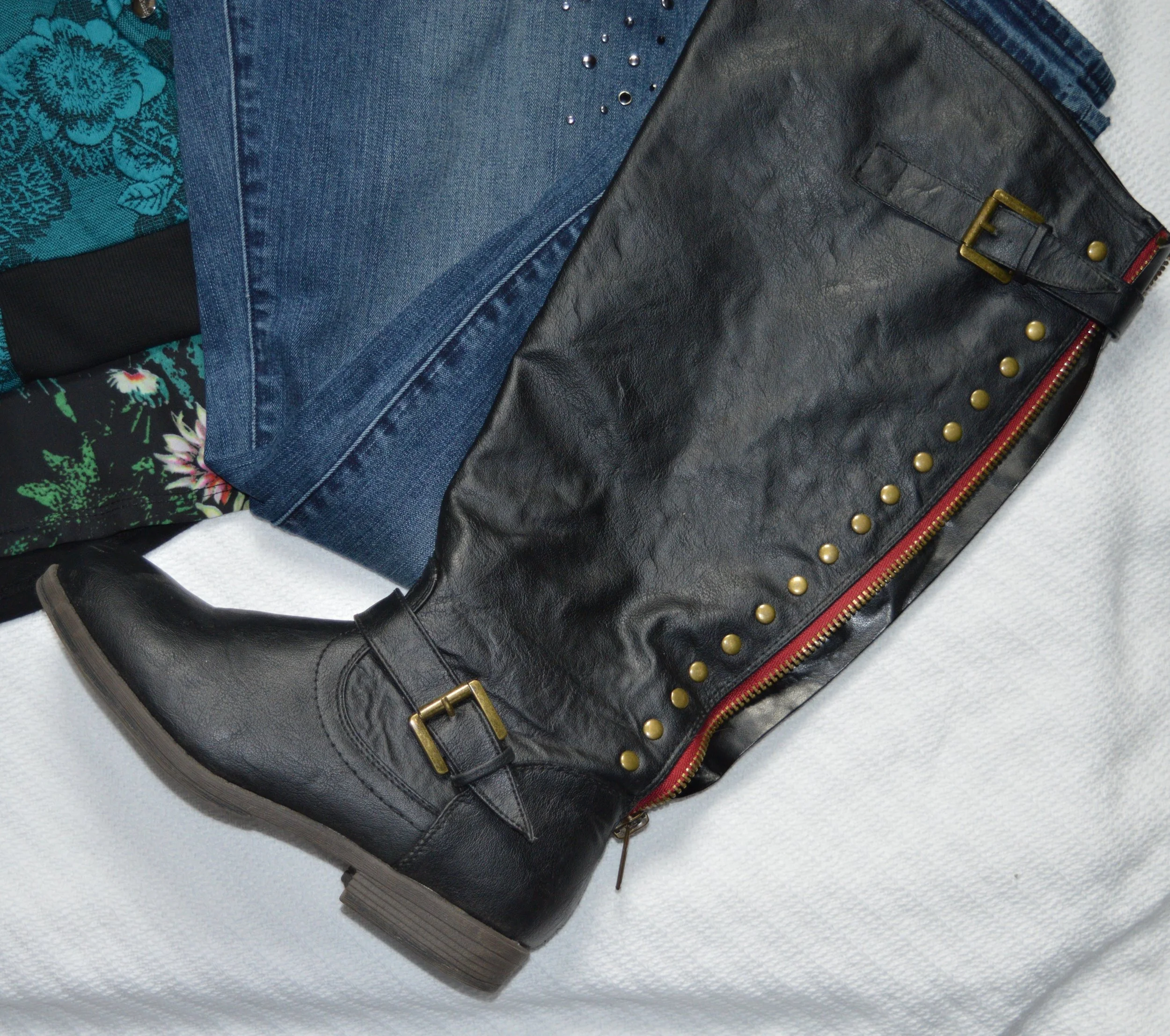 Since the top contains some red, I chose red for my accessories, including my tall, black, studded boots that have red detailing along the zipper on the back.