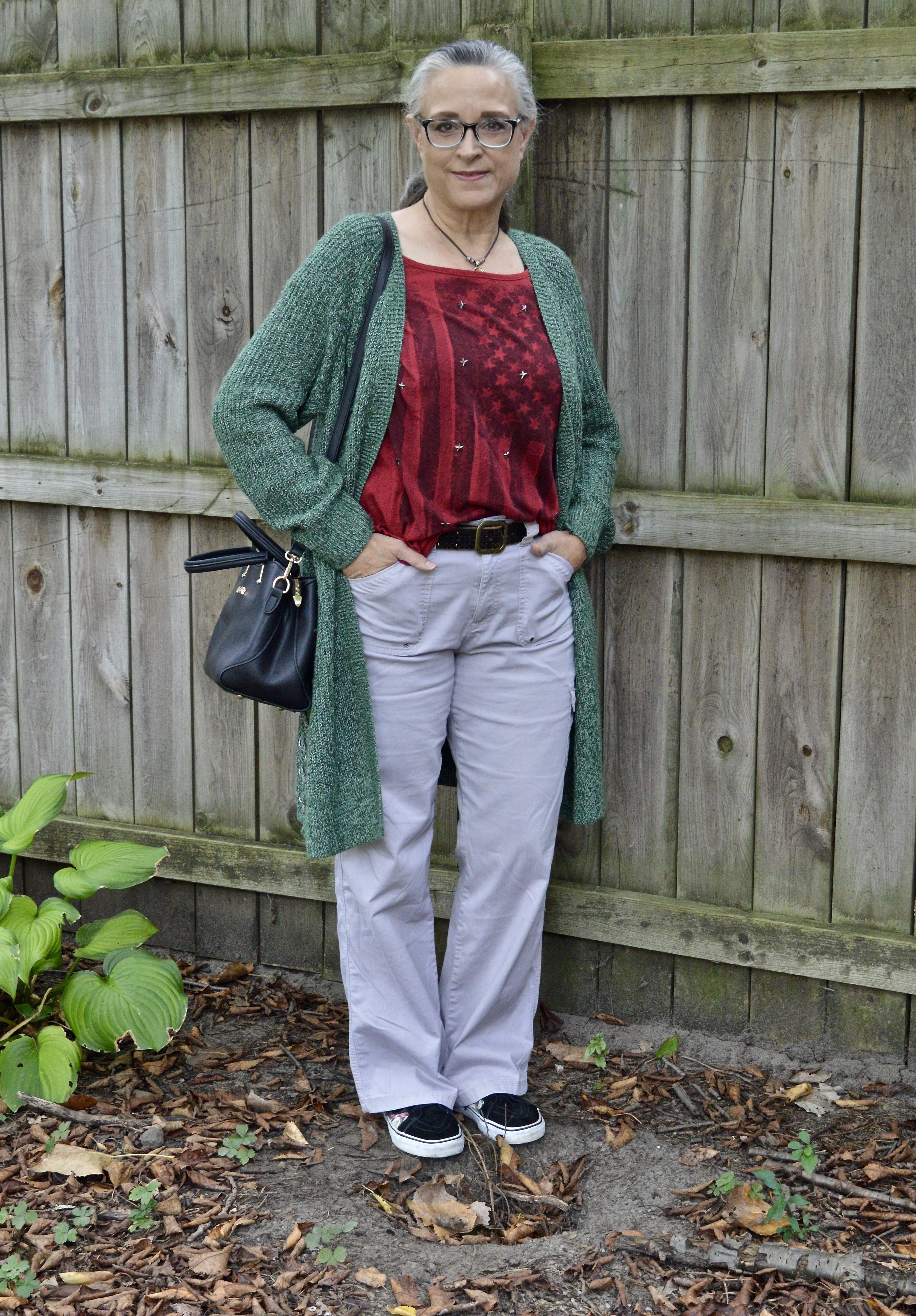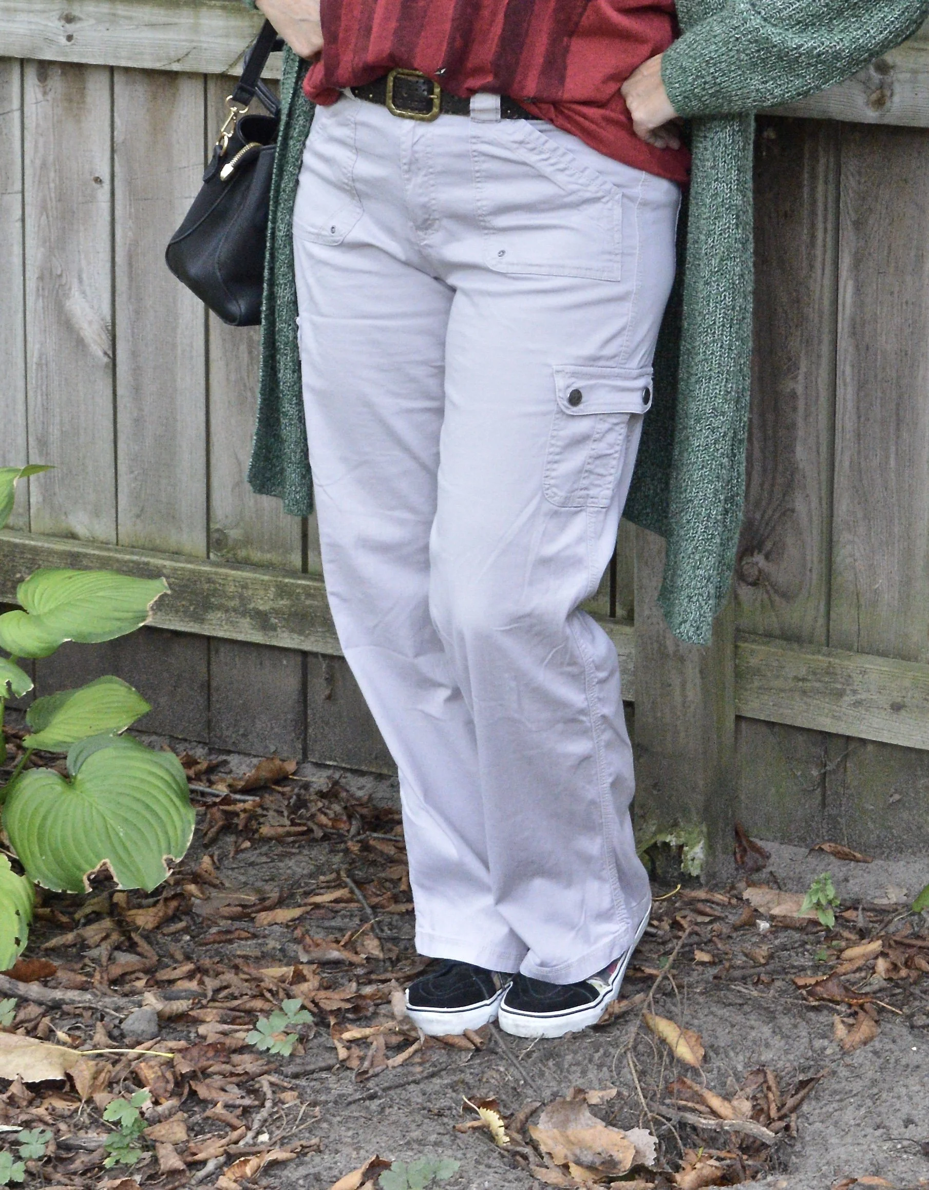The final piece I added to this outfit is the over sized, knee length, Denim & Co cardigan. This piece was another thrift treasure, and I am using it a lot this fall, as a coatigan. It is a heavy weight chenille, and includes both buttons and a tie. I like how it looks open, better, but I am thinking I might like it closed with a different belt.