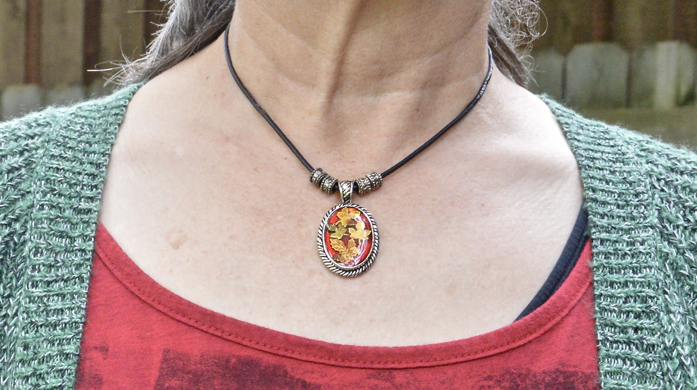 For jewelry I added a simple choker pendant. I found this at a thrift store and love the pressed flower look of the pendant.
