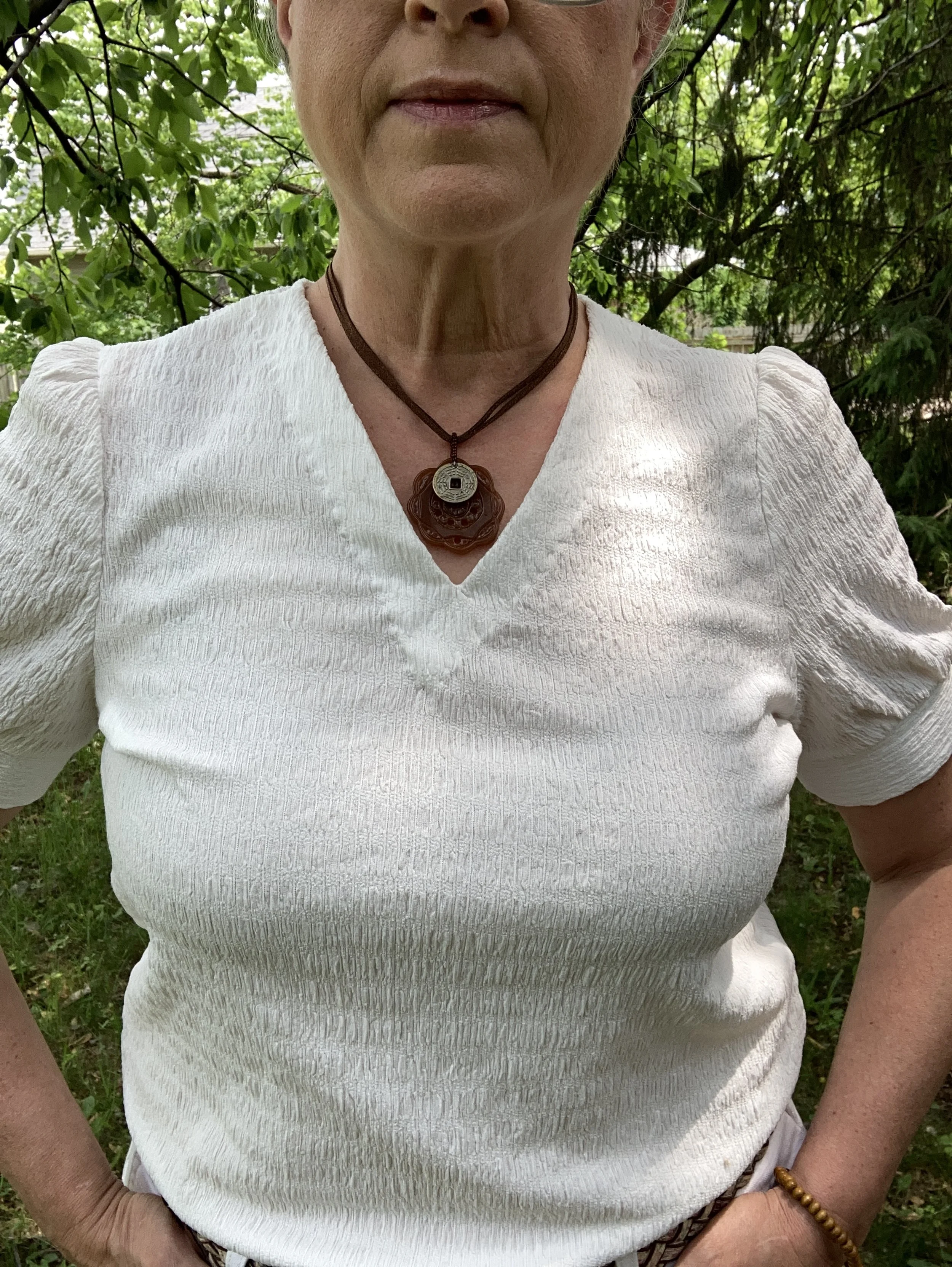 My top is Adrianna Papell brand. This brand seems to specialize in special event gowns and dresses. I love the crinkly texture and the “just enough puff” sleeves. I really don’t like anything too poofy, as my shoulders are a bit broader. That’s why I was never a fan of shoulder pads. If they are removable, I take them out of my blazers, dresses or tops that come with them. You can also see the necklace I added in keeping with the brown theme.