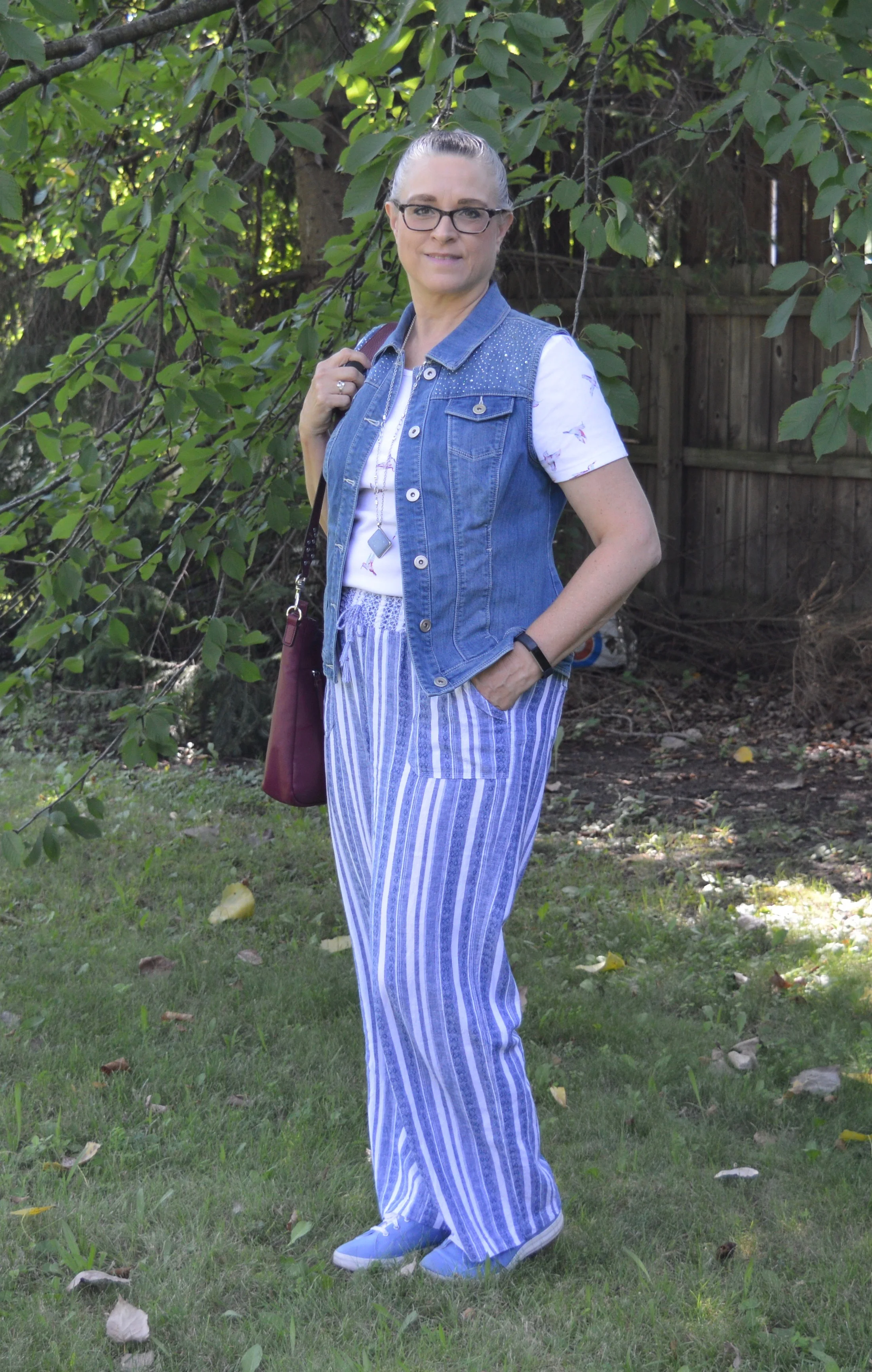 I added my denim vest from Christopher and Banks to bring cohesion to the outfit. This vest has gotten a lot of use on the blog over the last three years. It is pieces like these that become the work horses of our wardrobes and can be worn all year round. You can see how I styled it with polka dot jeans, a printed maxi skirt, over a sleeveless top, with a leopard print skirt and with a denim dress and a chambray shirt. You can click on any of those to see some of the other ways I’ve styled this vest.