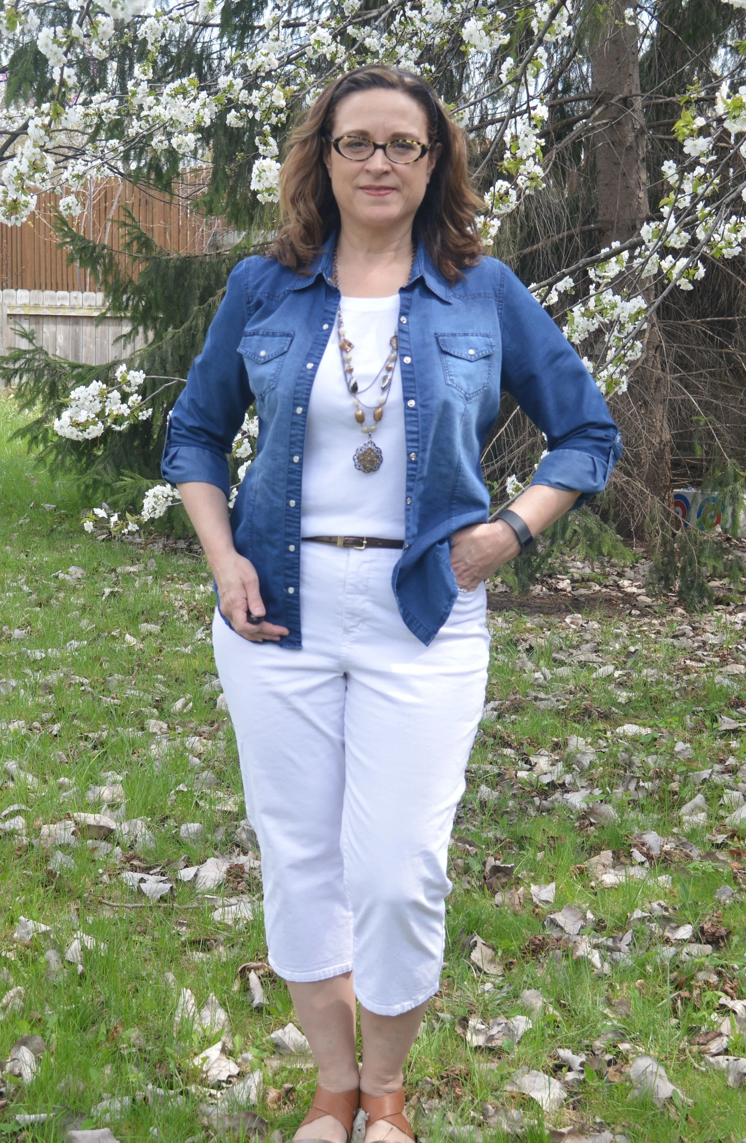 I decided to wear a tee instead of a tank top and I also went with capri pants instead of longer ones. The dark wash of my chambray shirt is similar to the one Laurie uses. I also kept my accessories to hues of brown and gold.