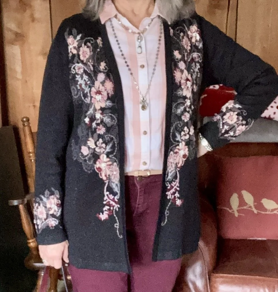What inspired me to follow the winter trends for this month was this gorgeous cardigan my best friend gifted me when we went to New York the weekend between Christmas and New Years. She felt it was too big on her and thought it might look better on someone with a bit more height and with broader shoulders. I absolutely love it. It is a thrifted Christopher and Banks piece and what can I say except the embroidery is stunning, and contains a beautiful blend of burgundy, pale to medium pink, as well as white and gray. The sweater has a bit of luminous silver threads through out and is gathered in the back for a better fit. I’m adding a few embellished cardigans, though they may not have embroidery.