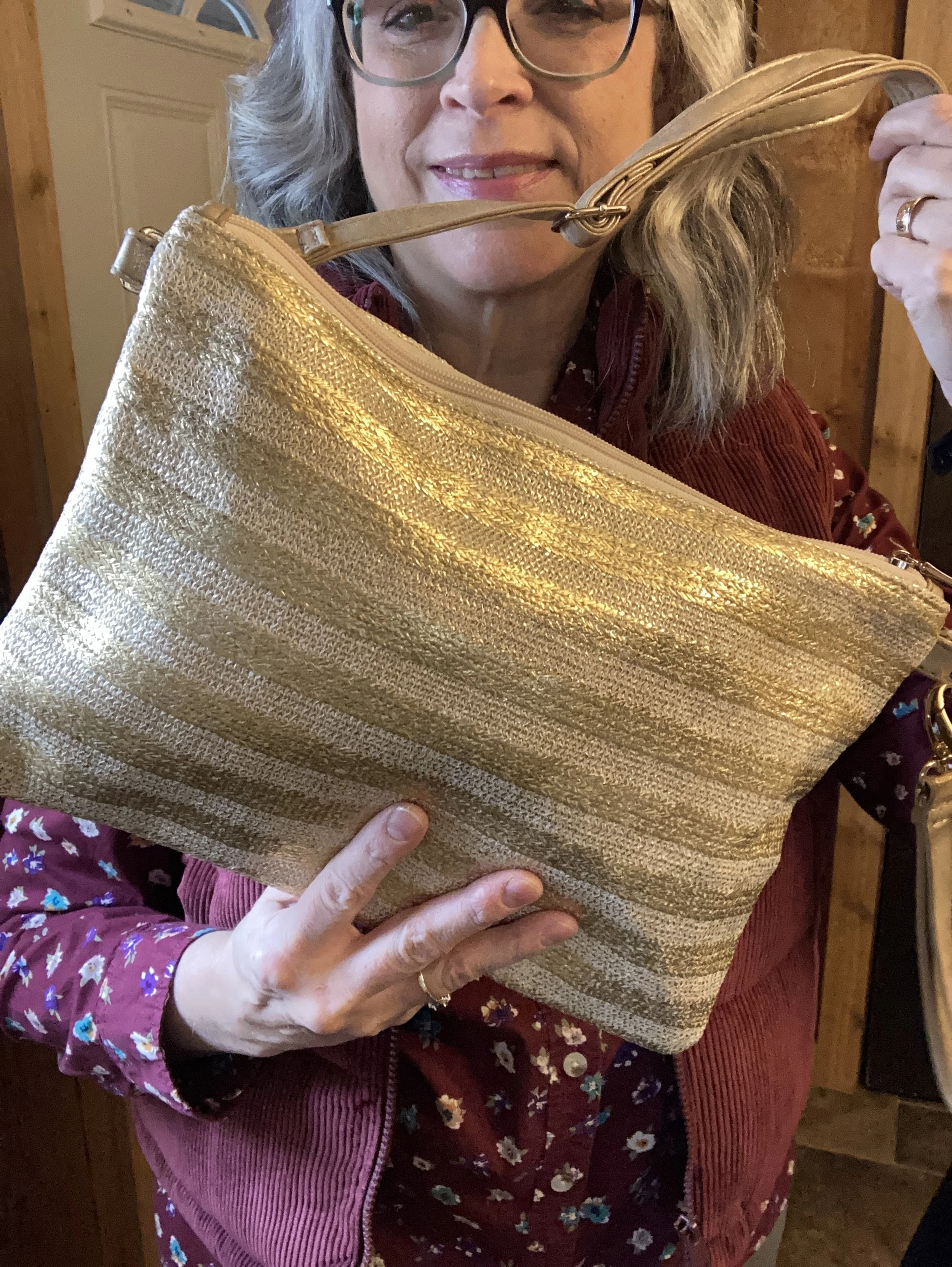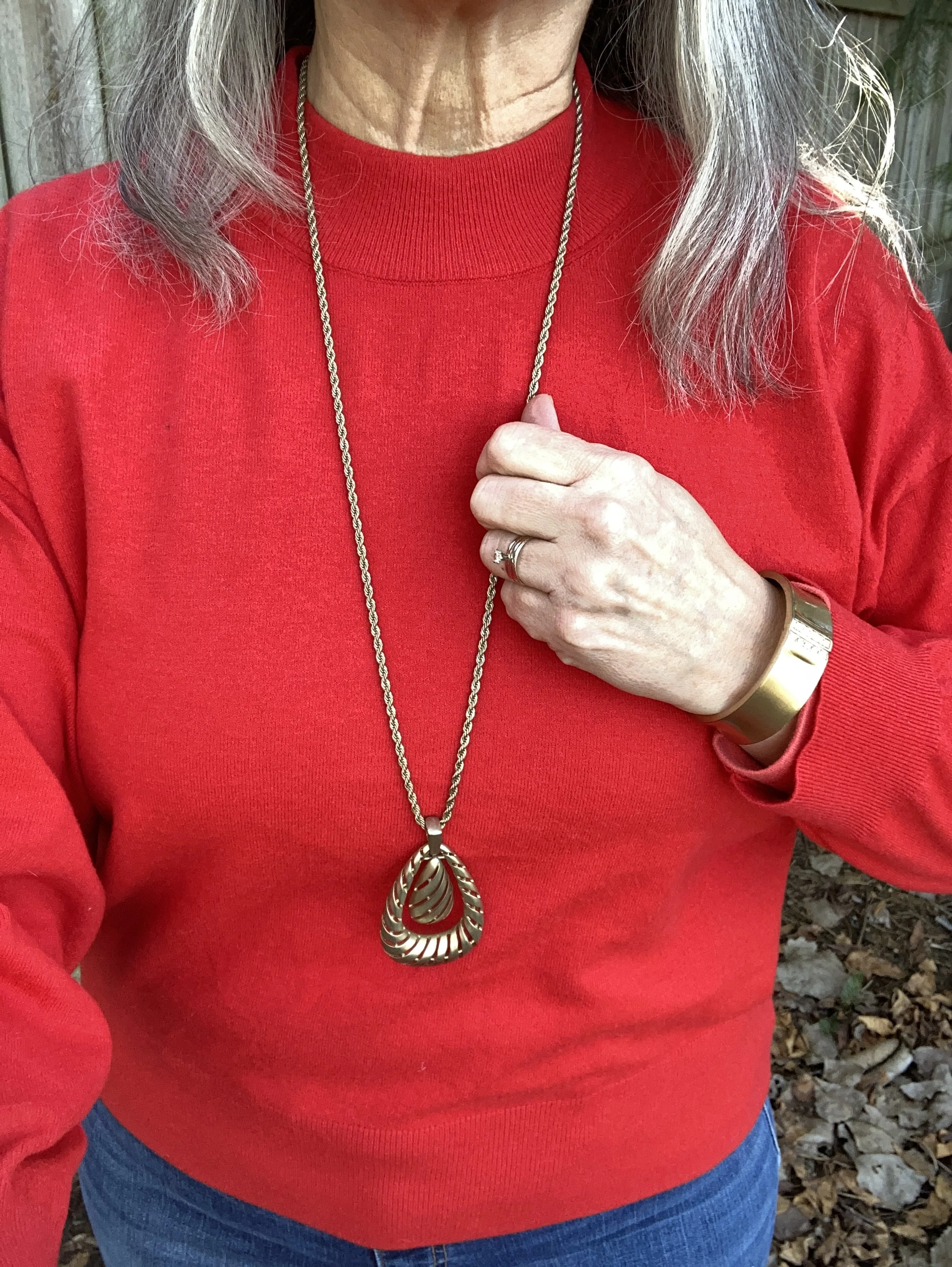 I thought gold was a good choice for my accessories and they really stand out against the background of burgundy. The gold necklace I purchased from a retail store which might have been Kohl’s or JCPenney. I don’t remember. The gold clutch/crossbody bag was a thrift find.
