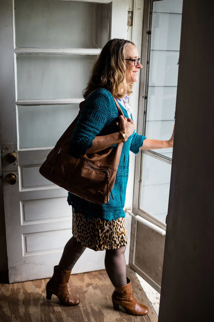 The only other accessories I had besides my beads were my faux suede boots and my gray convertible bag. These navy SO ankle boots have been on repeat this winter since I purchased them online from Kohl’s. My Evan Picone bag was a thrift find. I like that it can be carried as a top handle tote bag and also as a smaller cross body bag.