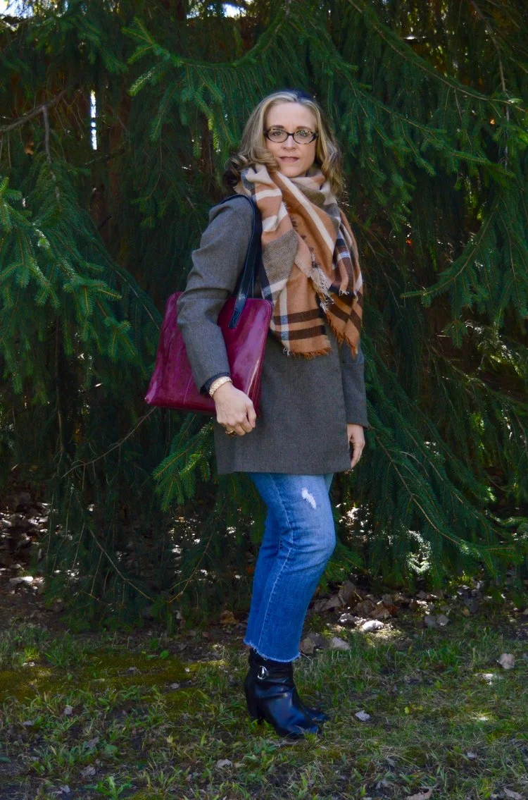 The sweater by itself provides texture, but the pattern across the top and shoulder area, as well as the buffalo plaid bag add interest and depth.