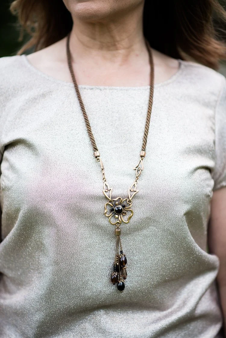 If you are a thrifter, or like to shop clearance racks always look at the jewelry and bags; you never know what you will find. Many of the purses I have were thrift store finds, including the blue and yellow tote bags, the woven basket bag and the sequin clutch; all seen above. Jewelry treasures are also found at thrift stores as you also saw above in the owl, and brassy flower pendant, as well as the stained glass shorter pendant. Thrift store finds are always so unique and typically may be things you wouldn’t find at your regular retailers.