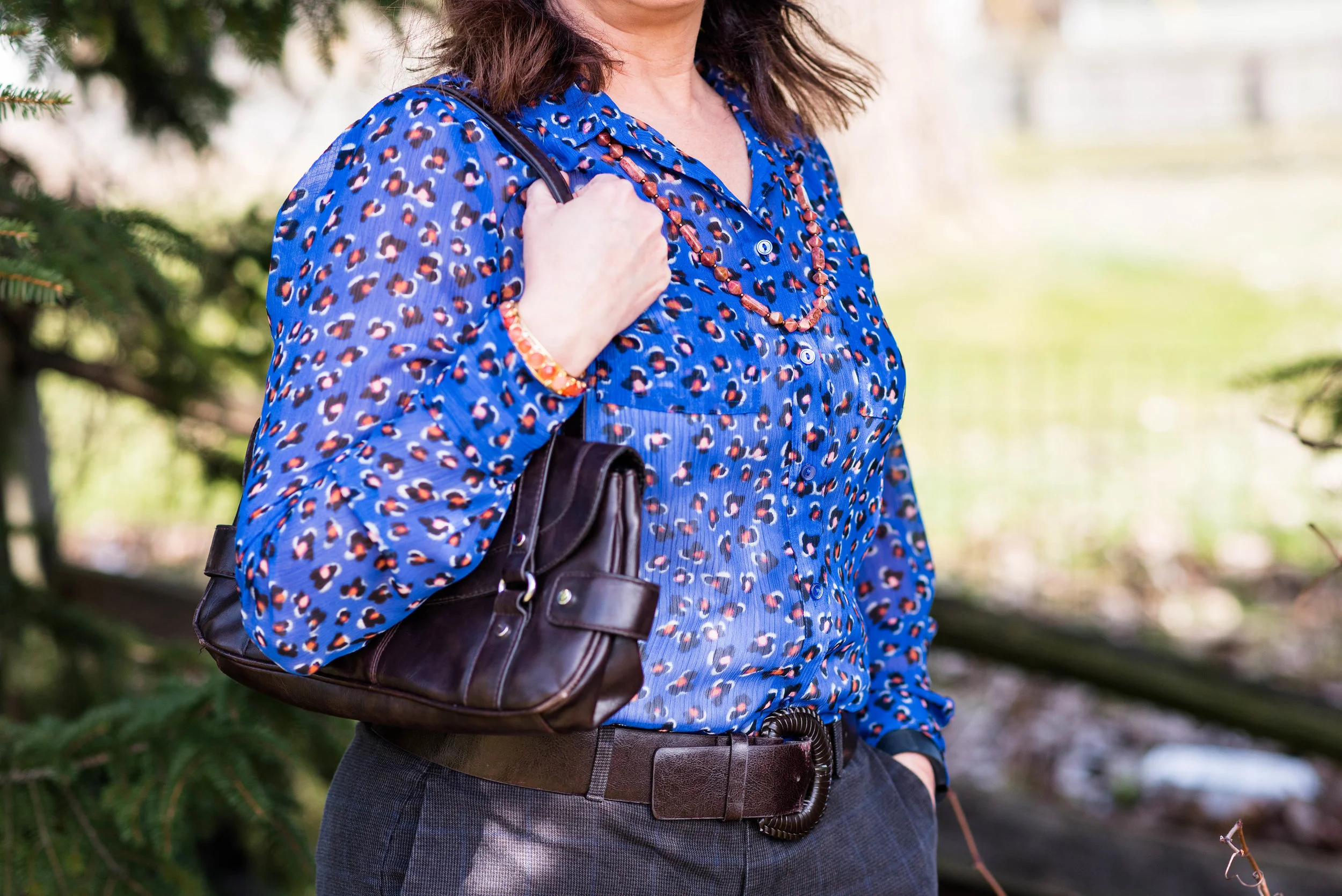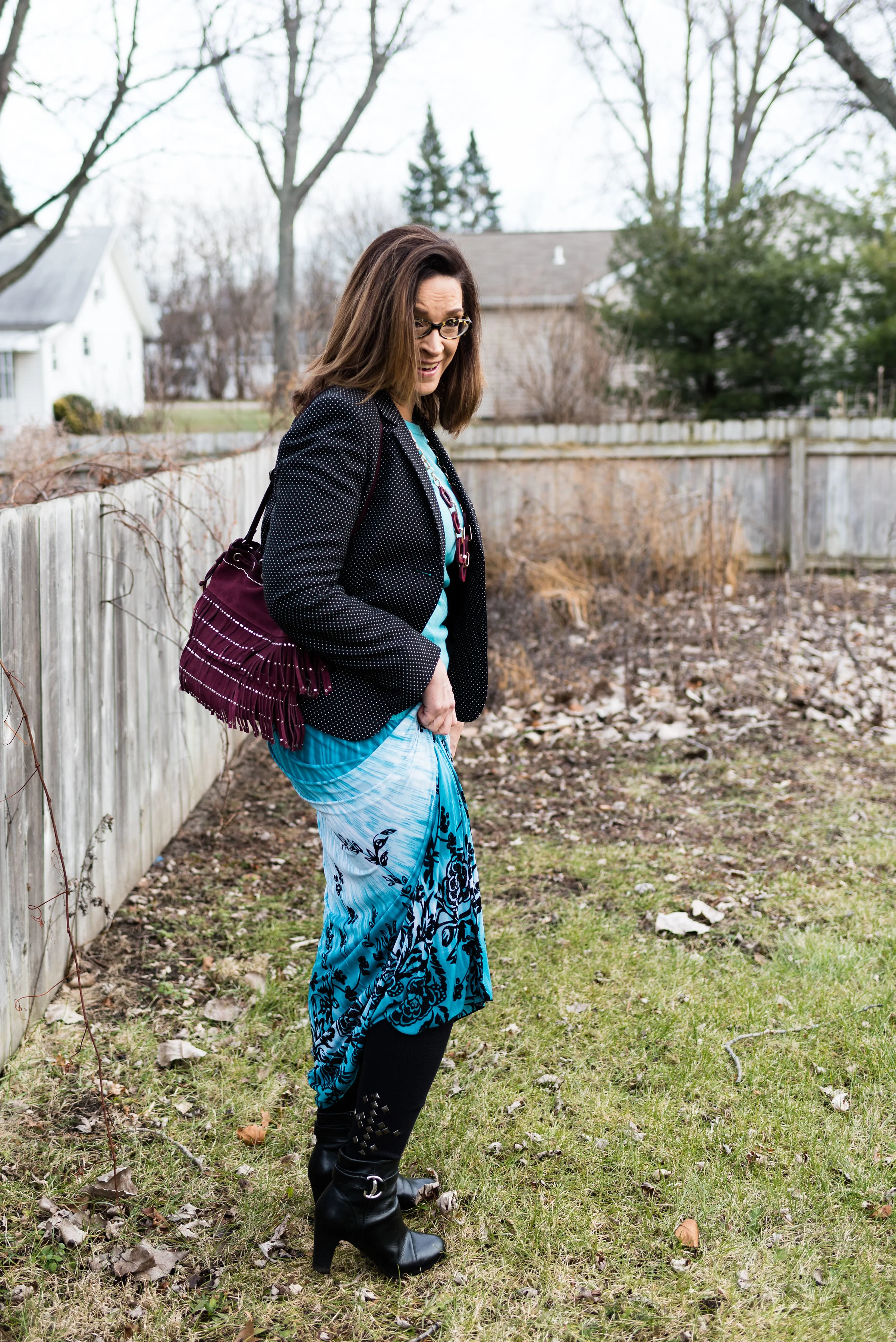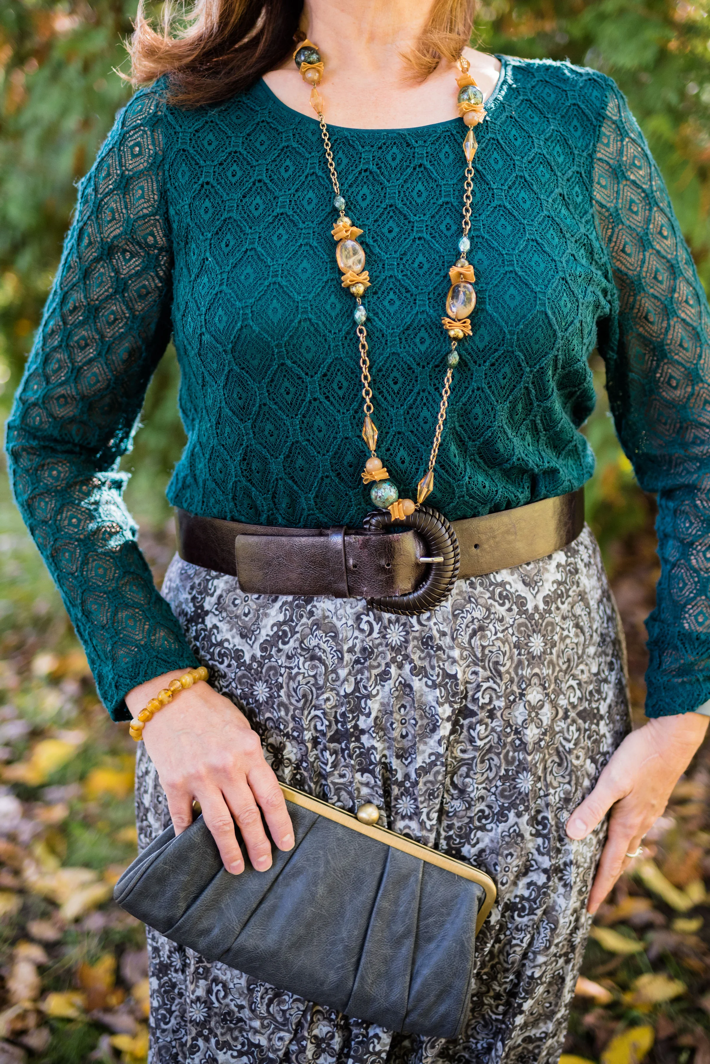 I decided to add a wide belt for this look. Another thrift find, this wide braided belt is a soft material that adds interest and texture. I thought the belt and my Vera Wang bag were a good match. You can also see I swapped out the black pendant necklace for my lovable owl, and replaced the metal and bead bracelet for some fun white and gold stretchies.
