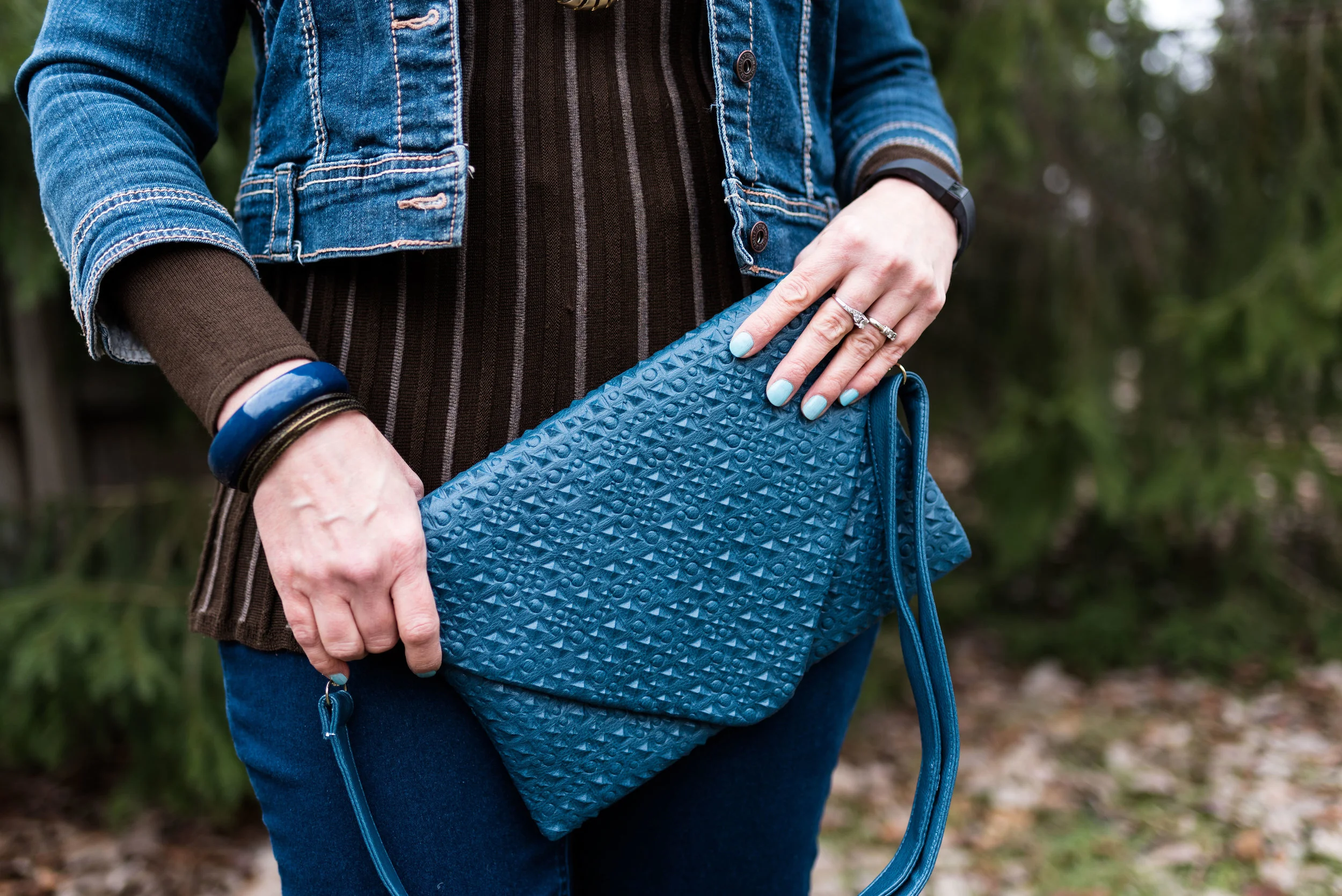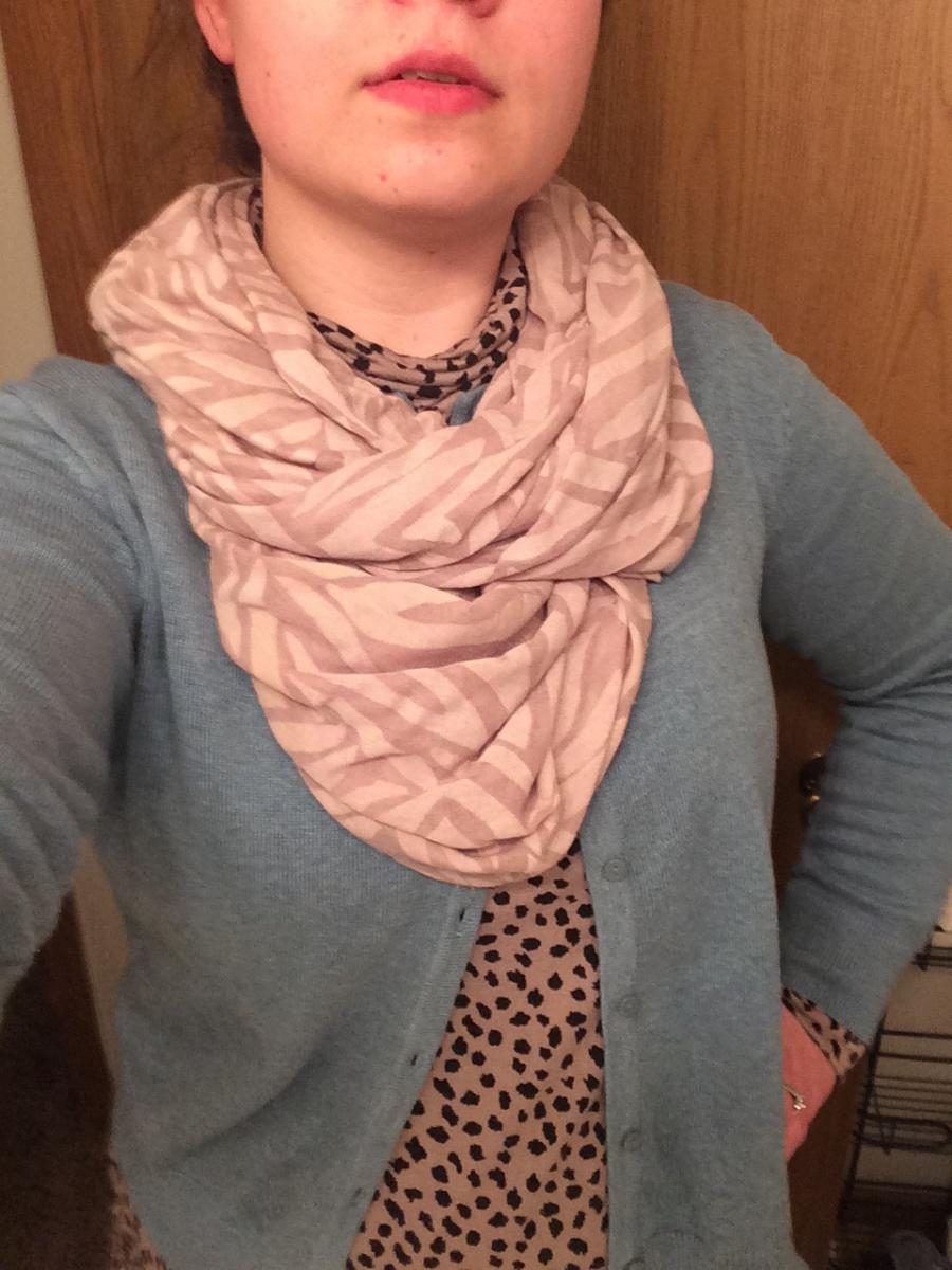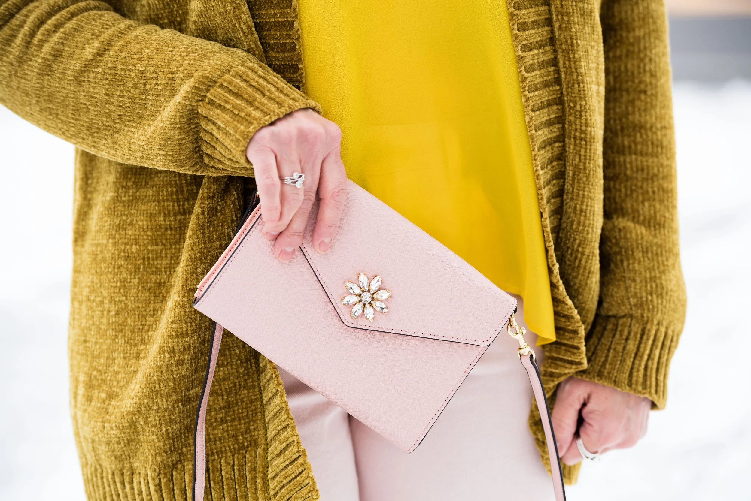 I decided to add a wide belt for this look. Another thrift find, this wide braided belt is a soft material that adds interest and texture. I thought the belt and my Vera Wang bag were a good match. You can also see I swapped out the black pendant necklace for my lovable owl, and replaced the metal and bead bracelet for some fun white and gold stretchies.