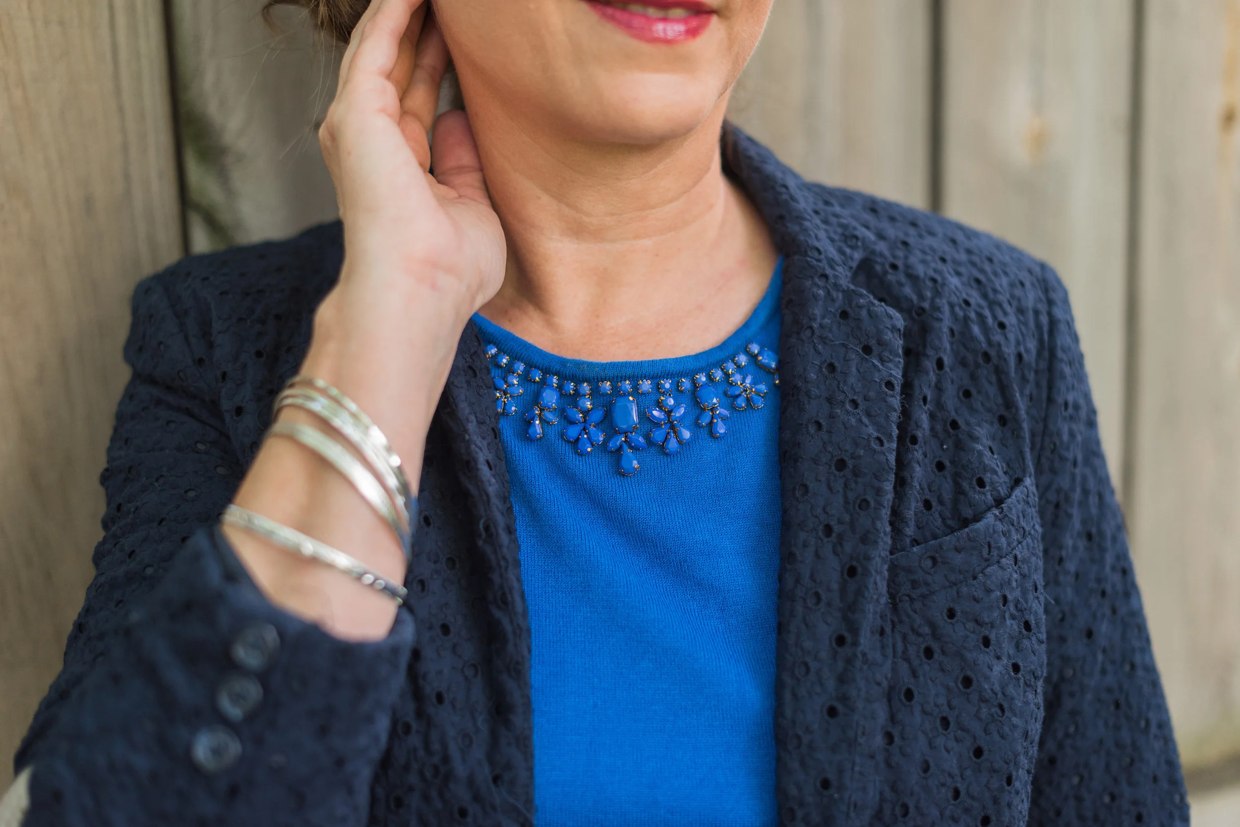 My tank top was a St. John’s Bay basic that I got at JC Penney a few seasons ago. I was excited to see it matched the blue in the skirt spot on. Of course with this skirt you could use pink, orange, white or black, or even mix it up with a totally different color like mint green, or sunflower yellow. That is exactly why I like to call this monthly column, Color Play, to stretch our minds as to what sorts of colors go together.
