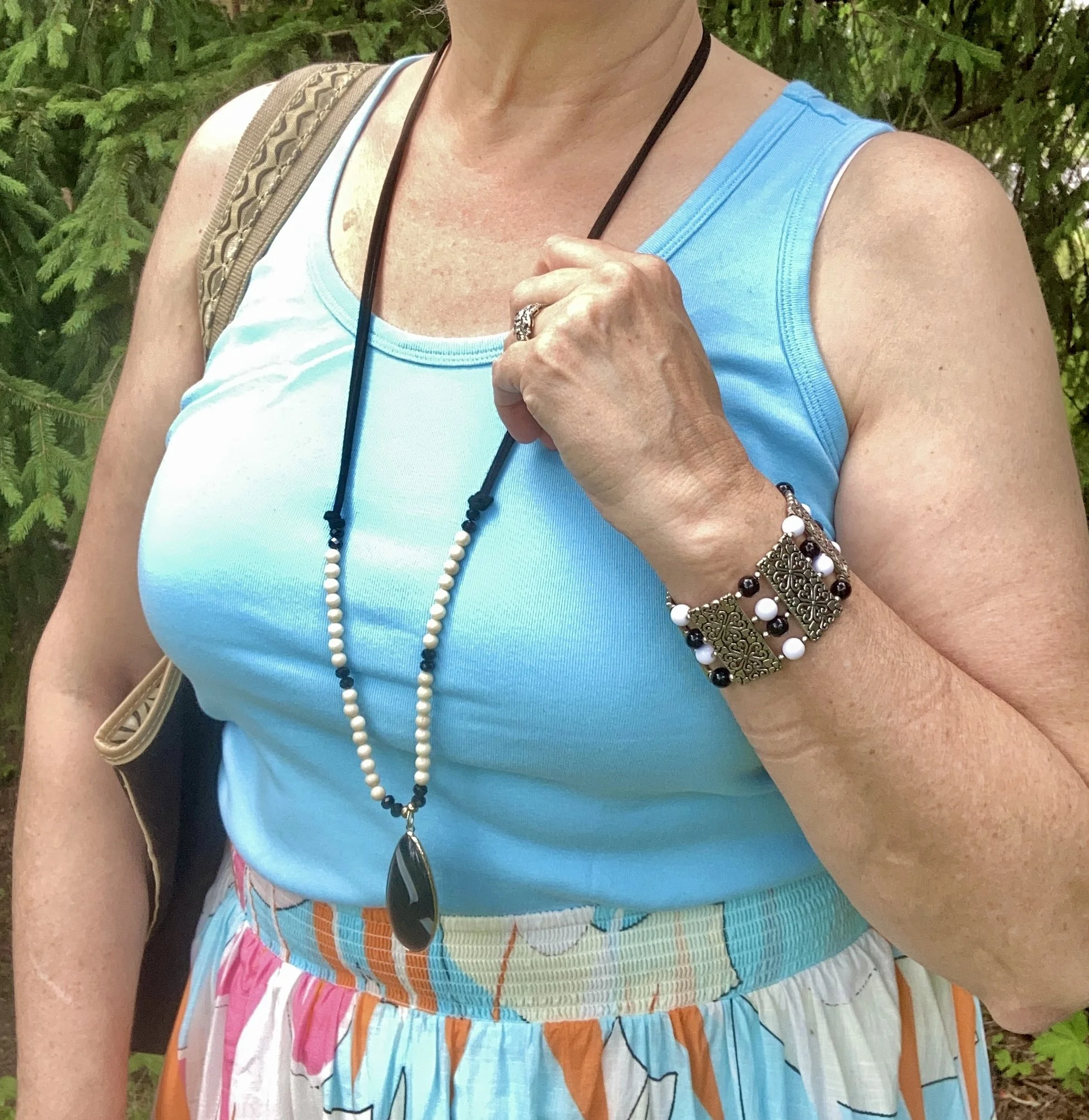 The jewelry wasn’t made to go together, but they certainly work well together. The necklace I got a few months ago at my favorite thrift store around the corner. The bracelet was a clearance purchase probably from Kohl’s or Penneys.