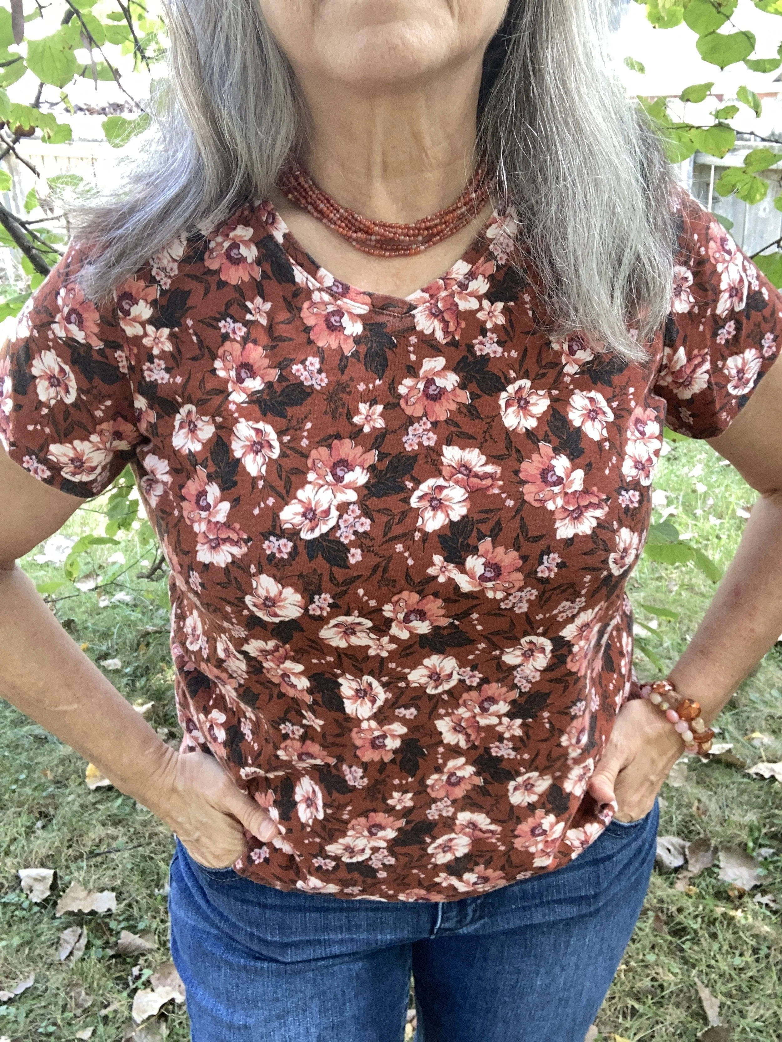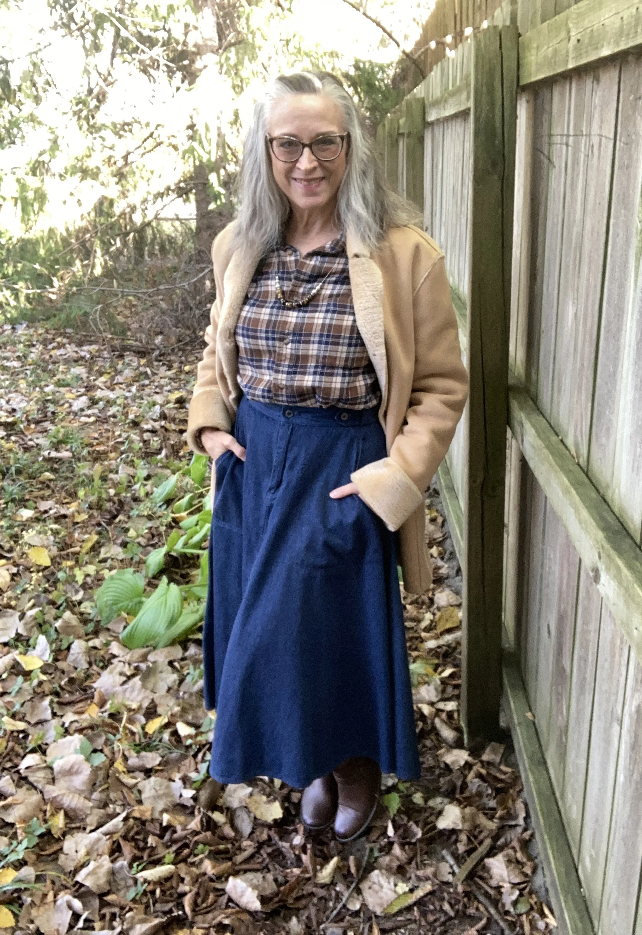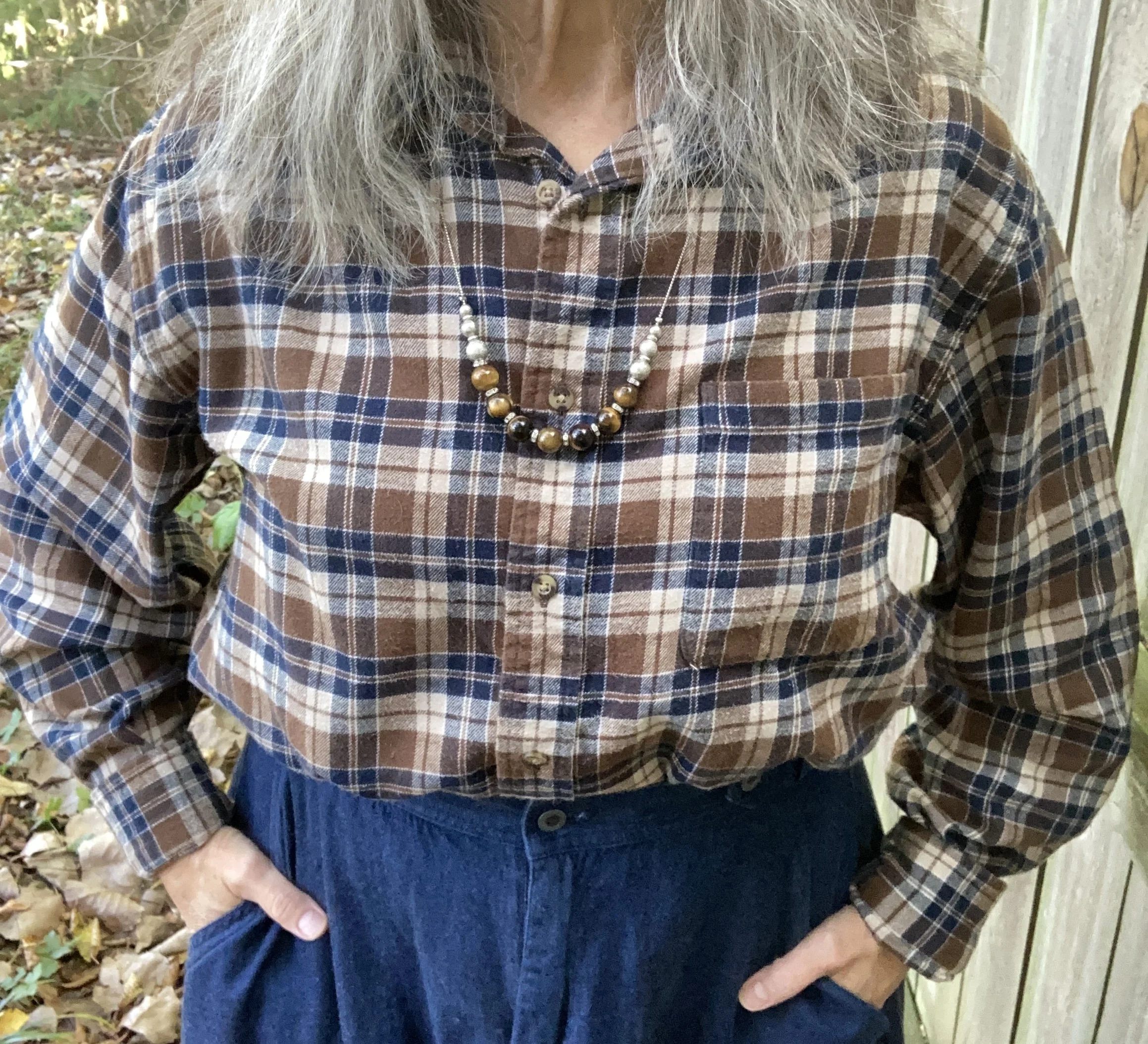 For this look, I started with the plaid, flannel shirt. It is a men’s Croft & Barrow shirt from Kohl’s. It actually belonged to my hubby, but he never wore it, so I confiscated it. Ha, ha. I love flannel, oversized shirts and while this one is not very feminine, I enjoyed the challenge of making it into a more feminine look by adding the skirt. The shirt has both the dark, earthy brown and the dark blue, so it seemed perfect for the look I was trying to achieve. I also added the silver and brown beaded necklace for a little extra femininity.