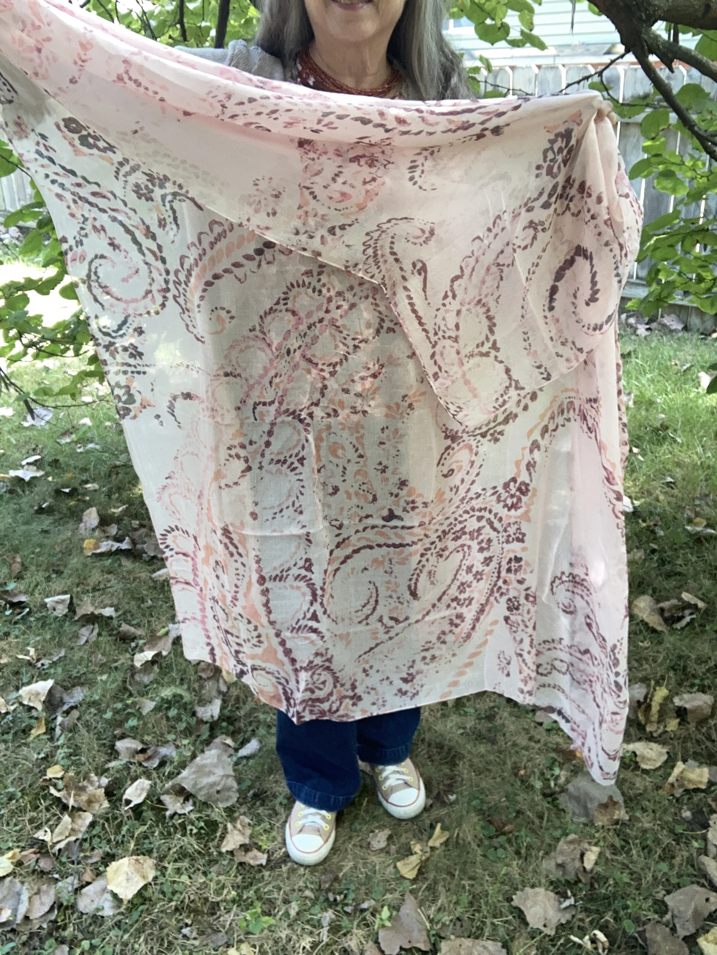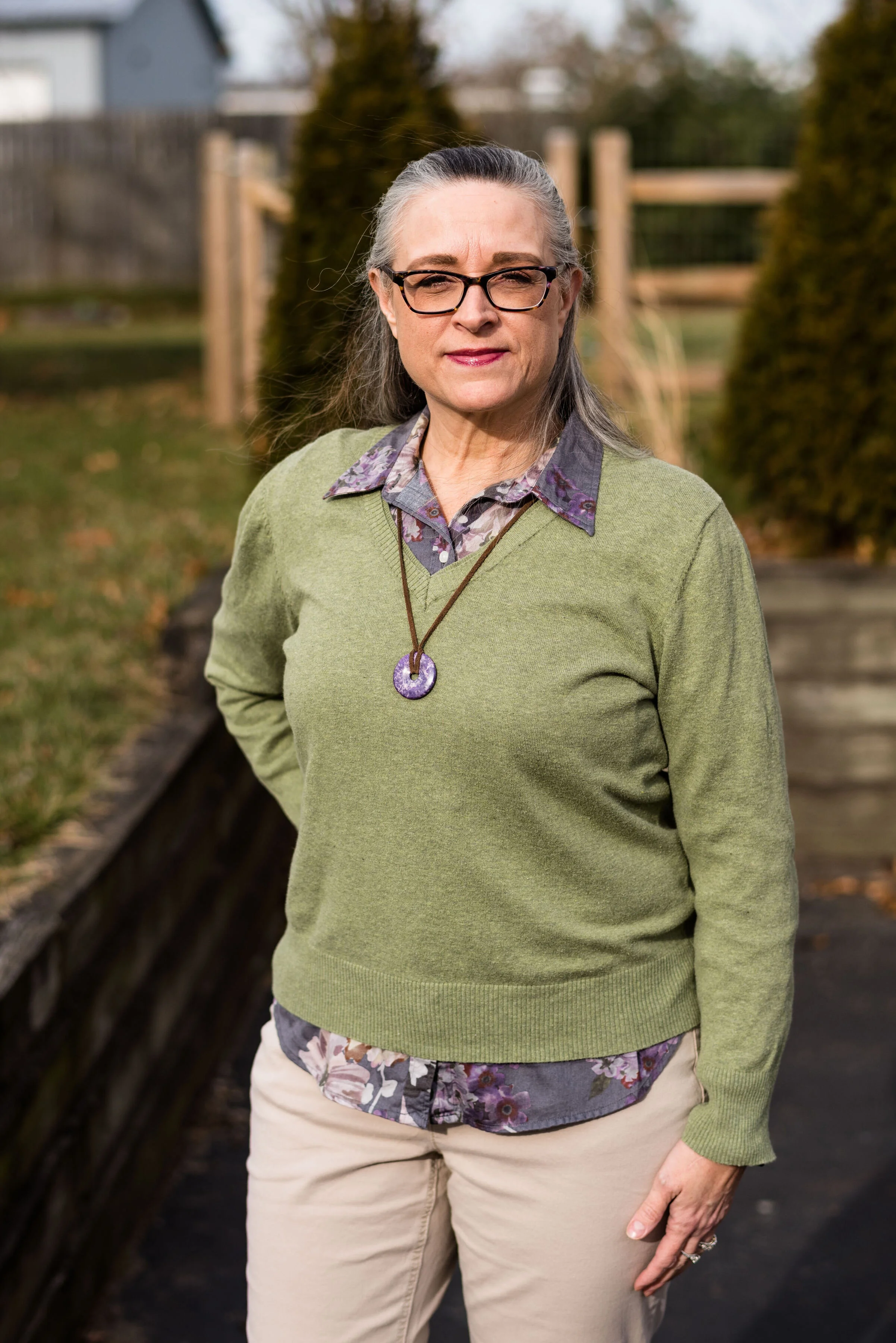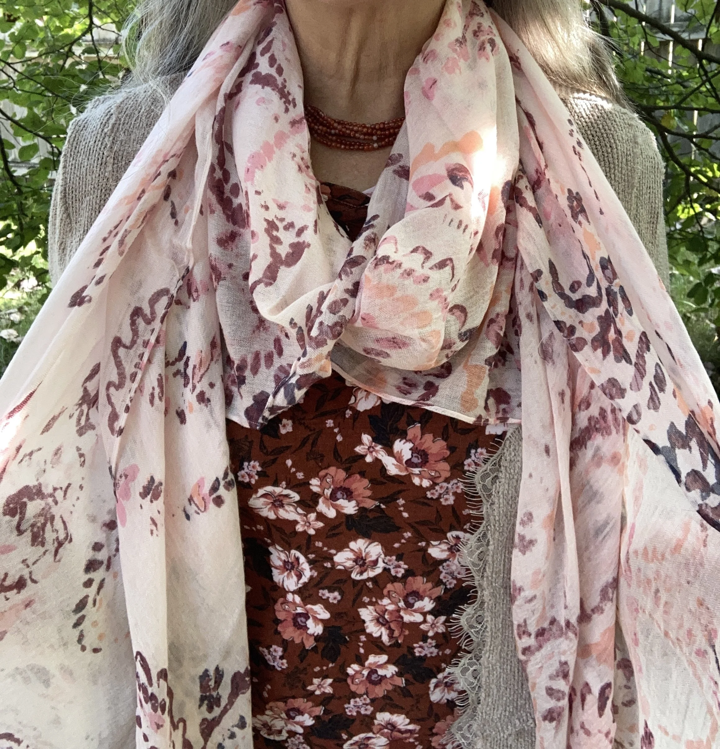 For this look, I started with the plaid, flannel shirt. It is a men’s Croft & Barrow shirt from Kohl’s. It actually belonged to my hubby, but he never wore it, so I confiscated it. Ha, ha. I love flannel, oversized shirts and while this one is not very feminine, I enjoyed the challenge of making it into a more feminine look by adding the skirt. The shirt has both the dark, earthy brown and the dark blue, so it seemed perfect for the look I was trying to achieve. I also added the silver and brown beaded necklace for a little extra femininity.