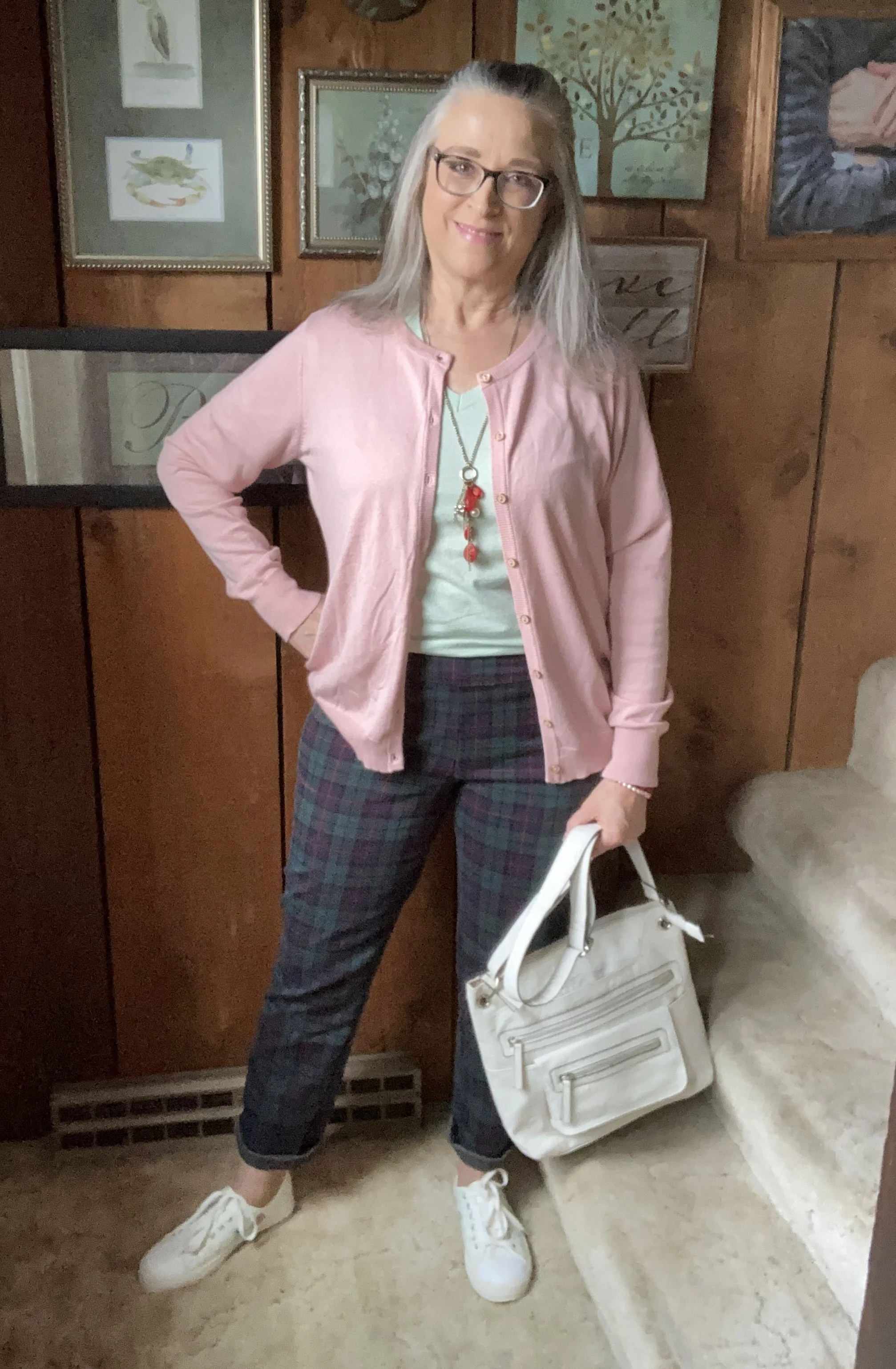 Plaid always comes around for fall, at least in my closet it does. I love my flannel shirts, my wool blazers and my plaid pants and skirts. This year plaid is back in earthy browns and rusts on the runway. See this article from Glamour. I guess you could say I was going for the Town and Country Chic vibe with this outfit.