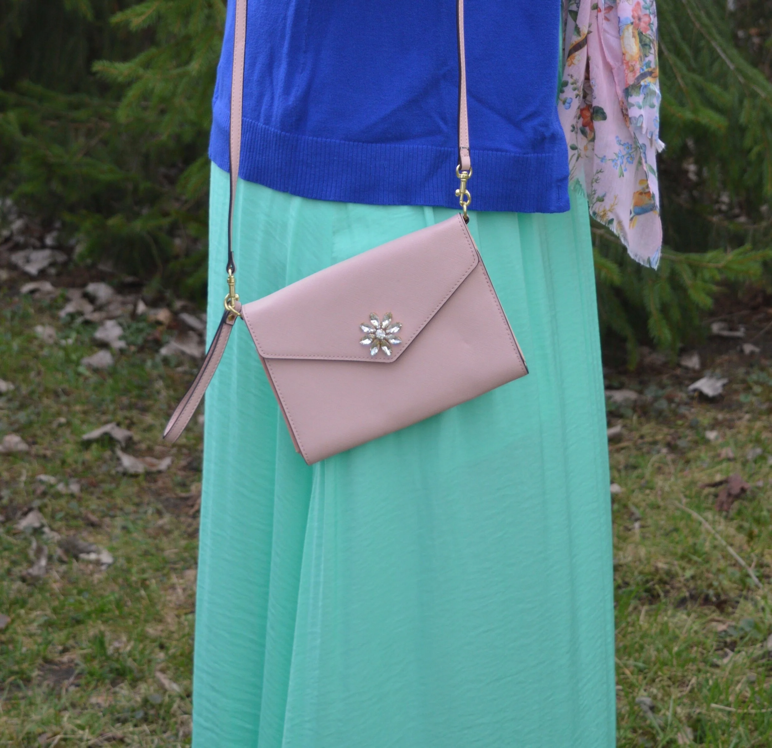 Today’s outfit centers around the pretty print scarf I got as a gift. A fiesta of feathery friends, and flowers adorns the light pink background on this long, rectangular piece. There are plenty of colors to choose from including several shades of blue, green and yellow. For this outfit I opted to focus on the blue, green and pink.