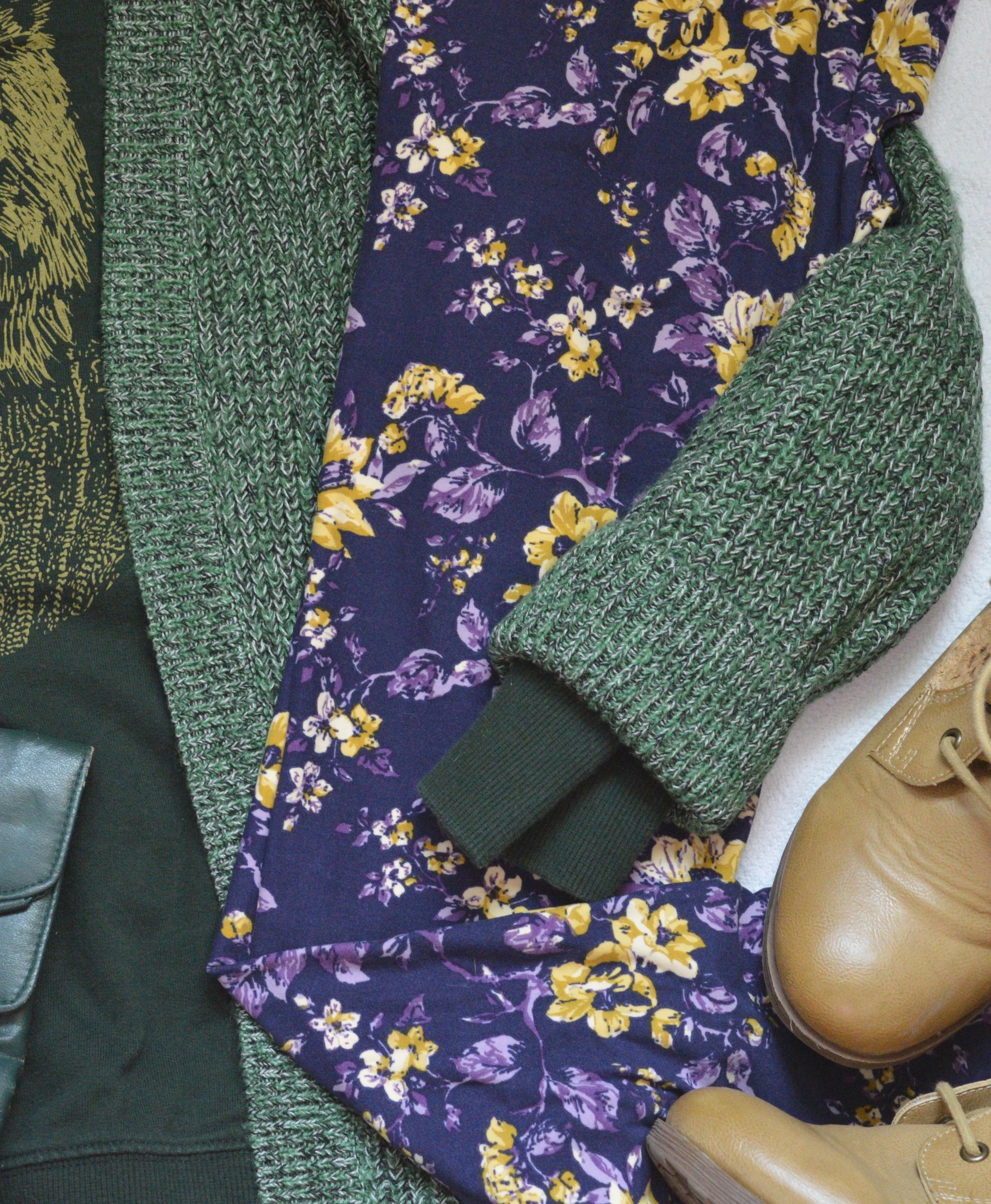 This week’s outfit was based on the dark floral trend which was prominent this fall. Dark florals are moody, mysterious and melodramatic and that is why I like them. Dark florals want to be noticed, but are just as happy being partially hidden under a jacket, sweater or blazer. So what does this flat lay look like in the flesh?