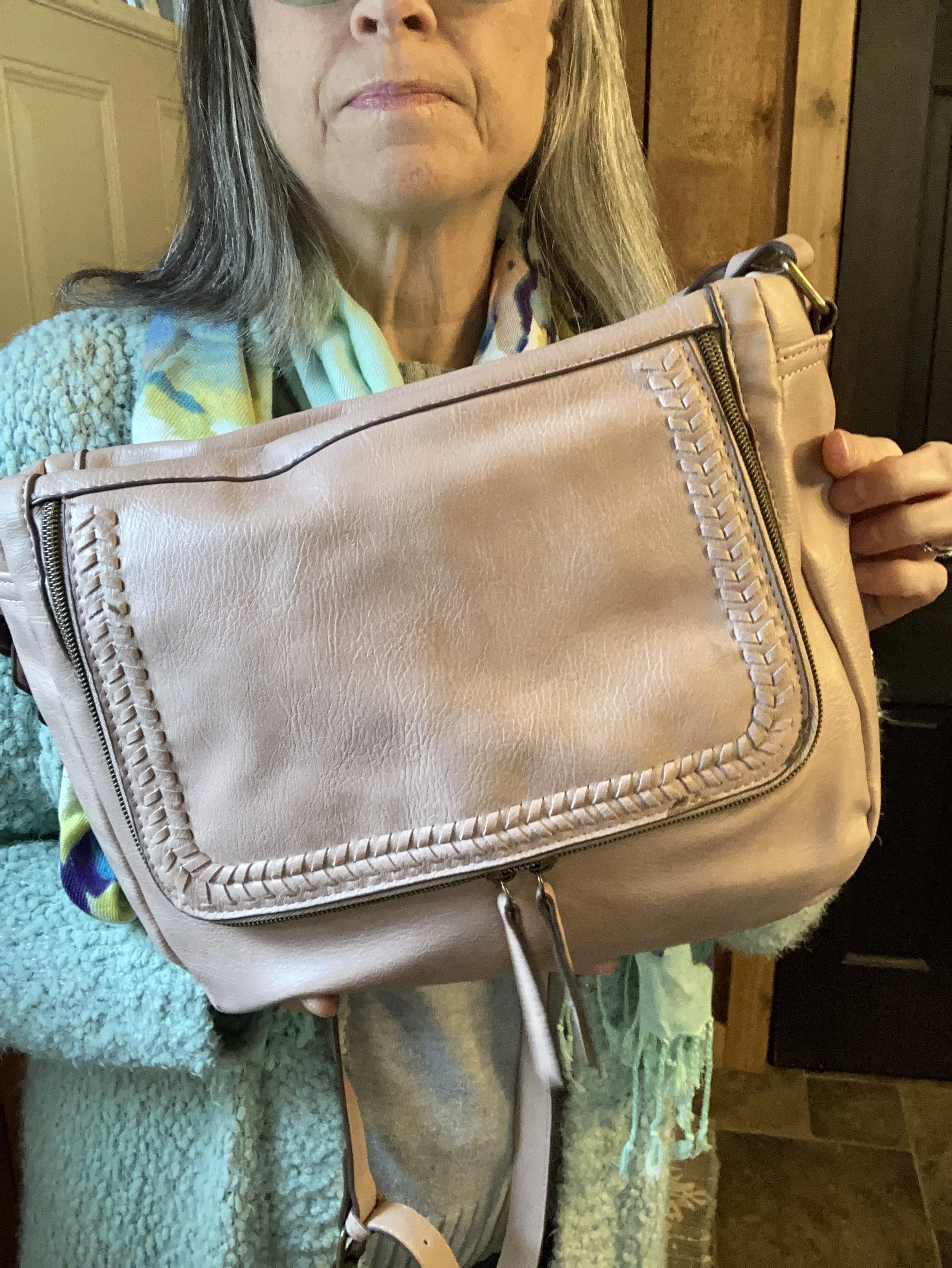 I chose pale pink for my other accessories, except my necklace which is dark purple agate. My cross body bag and my metallic Circus by Sam Edelman combat boots are both thrifted.