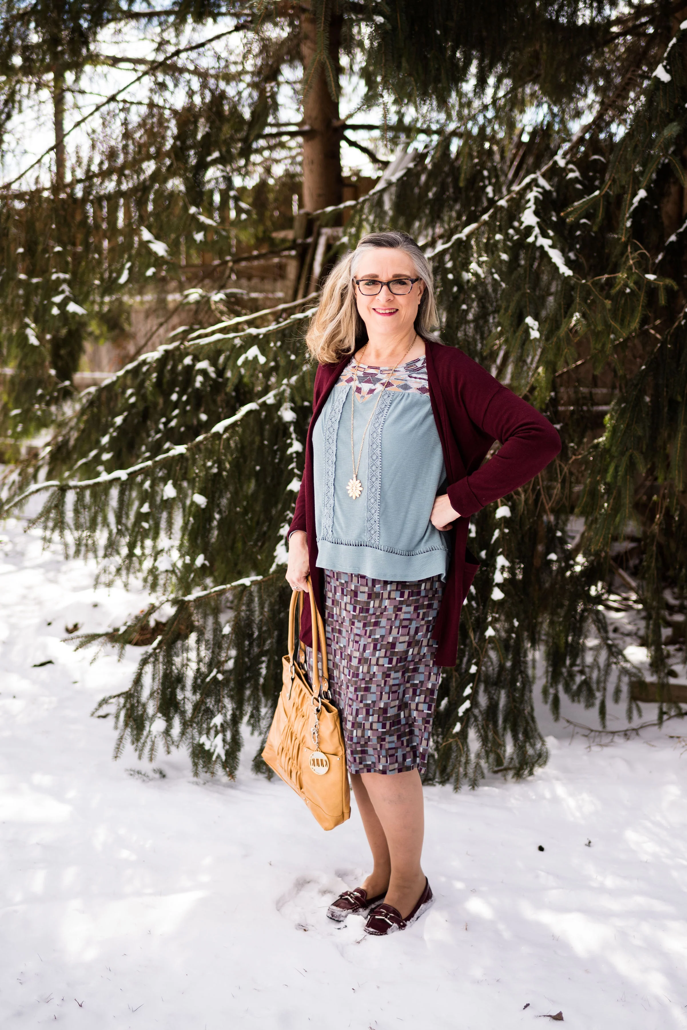 It was so cold when we were taking these pictures. My daughter was running back into the house after each outfit was finished, and she had on a hat, coat, gloves and boots. Ha, ha. My face is set in defiance of the blustery cold! That is definitely not my most flattering face.